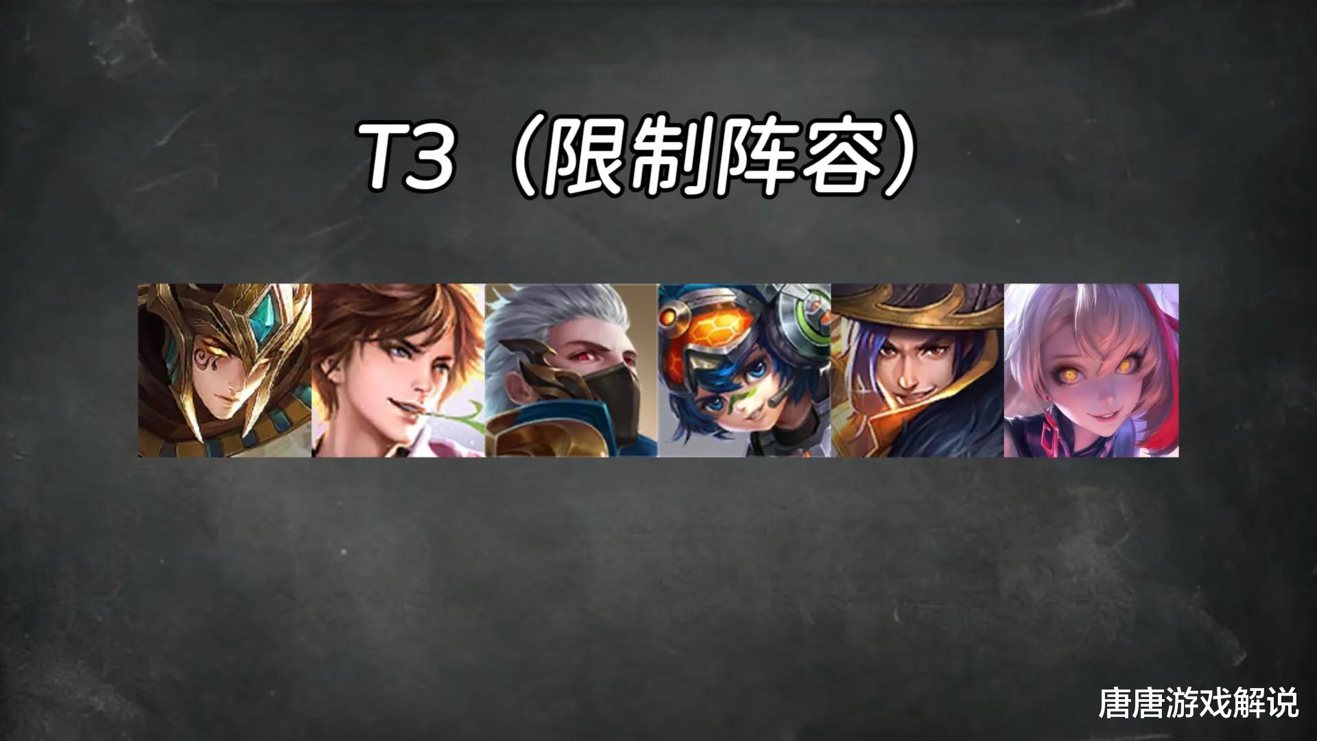T3强度的英雄有6位,他们在路人局表现很强,高分局也有靠过硬手法打出漂亮战绩的玩家,但他们的缺陷是很明显的,需要阵容适配才有良好的体验。