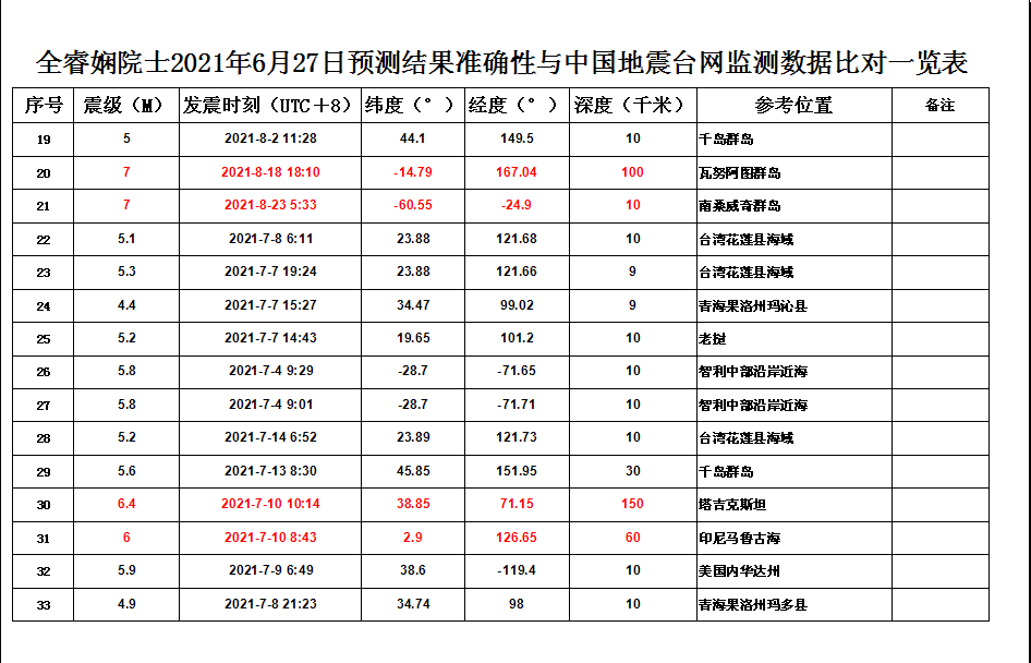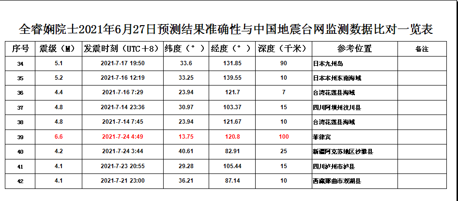 全睿娴2021年6月27日21点47分所做的地震预测,是否成功?请看《中国地震台网监测数据一览表》,答案即可揭晓!
