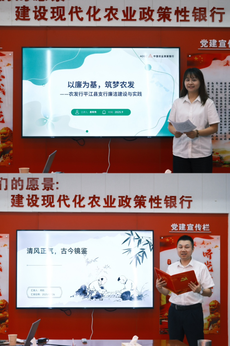 为深入推进全面从严治党、从严治行向纵深发展,扎实落实上级行关于加强廉洁文化建设的部署要求,近日,中国农业发展银行平江县支行举办了一场别开生面的“青年说清廉”故事分享会。此次活动是平江县支行进一步加强“清莲”党建特色品牌建设、强化青年员工廉洁从业教育的重要举措之一,旨在引导青年干部员工扣好廉洁从业的“第一粒扣子”,筑牢拒腐防变的思想道德防线。