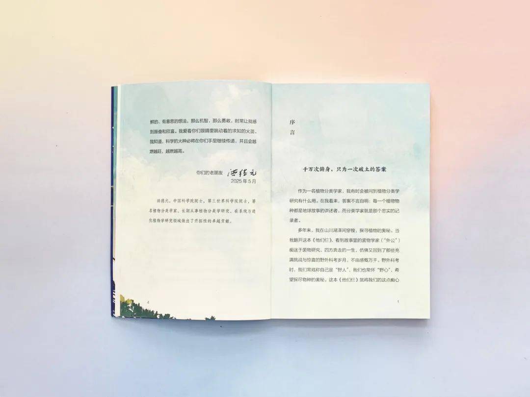 植物学家洪德元院士在“致小读者”中勉励青少年:“踏遍千山才有新的发现,无数次实验才有新的突破,这些都足以抵消所有的疲乏和伤痛。这种来自心灵最深处的精神上的满足,是值得拼尽全力去追求的,也希望你们能体会到这种快乐。”