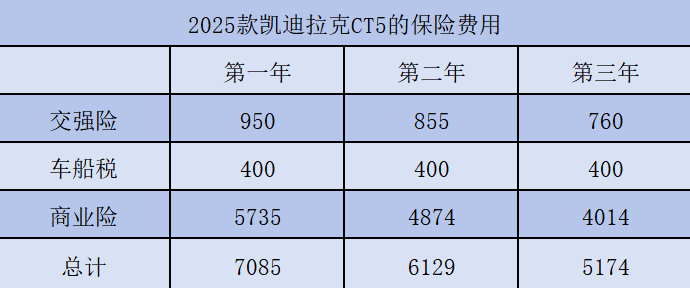 凯迪拉克CT5的保险分为必交和选交两种,其中交强险和车船税是必须要缴纳的,首年费用分别为950元和400元。如果连续两年不出险的话,交强险会有9折和8折的优惠,具体费用如上图所示。商业险建议新手或停车环境复杂的朋友增加划痕险,如果驾龄较长的老司机,则可以考虑放弃选择。此处按照第三者赔付额度为100万来计算,同时还购买了车上人员责任险,首年商业险费用为5735元,总计7085元。连续三年不出险,保费会有所下调,三年的总费用为18388元。