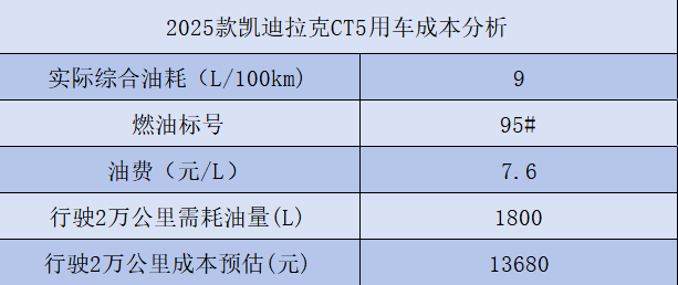 2025款凯迪拉克CT5在动力方面搭载2.0T+10AT动力系统,能带来174kW的最大功率,参数表现较为强劲。同时随着动力的提升,该款车的WLTC百公里综合油耗也达到7.51L,用车成本一般。不同消费者的驾驶里程和用车习惯不同,年用车成本的费用略有浮动,本文就以一年2万公里为例进行计算。根据车友圈的朋友讲述来看,该款车在拥堵路段的油耗为10L/100km,高速出行则能降到7L左右,如果按城市为主,高速为辅来看的话,该款车的综合油耗按9L/100km来计算还是比较合理的。