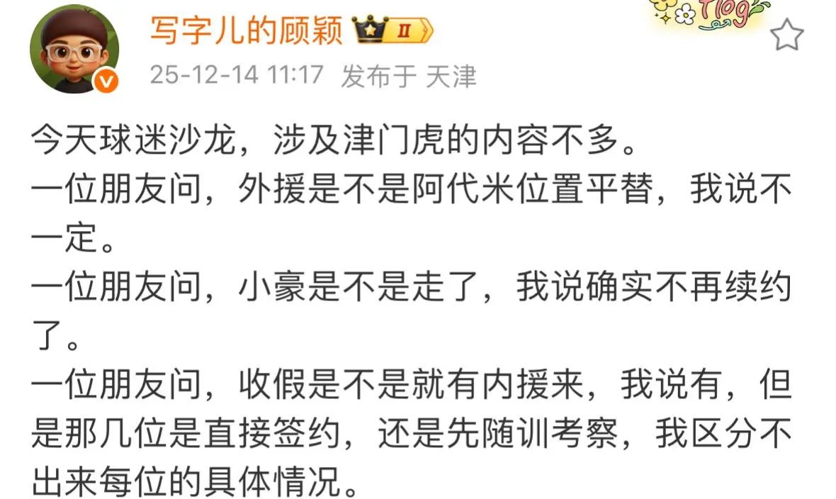 2025年12月14日,据天津当地记者顾颖最新消息,天津津门虎已挑选好了1名外援前锋,而他并不是来代替阿代米位置的纯边路球员,而是一名强力前锋;内援杨子豪已确定不再续约,会离开球队;同时球队还会签下几名内援,至于是直签还是要留队考察,暂时不能确定。考虑到俱乐部的预算只有1亿元,因此球队在引援方面肯定会更加谨慎,精心挑选球员也在情理之中。
