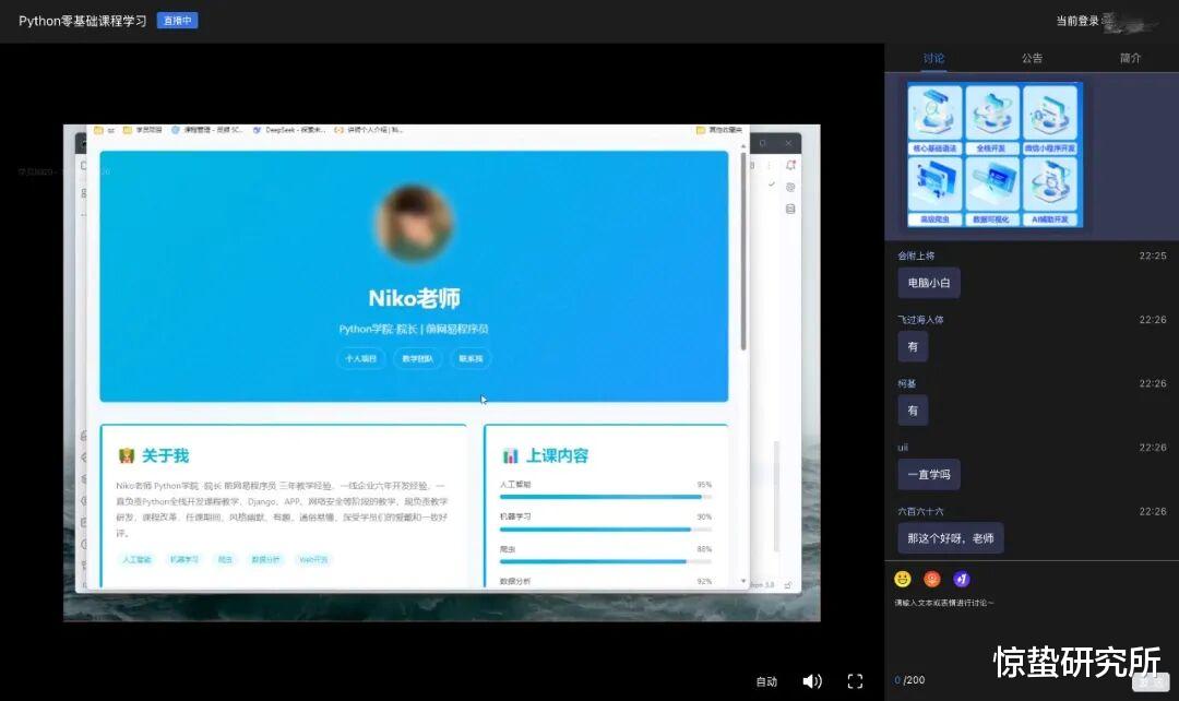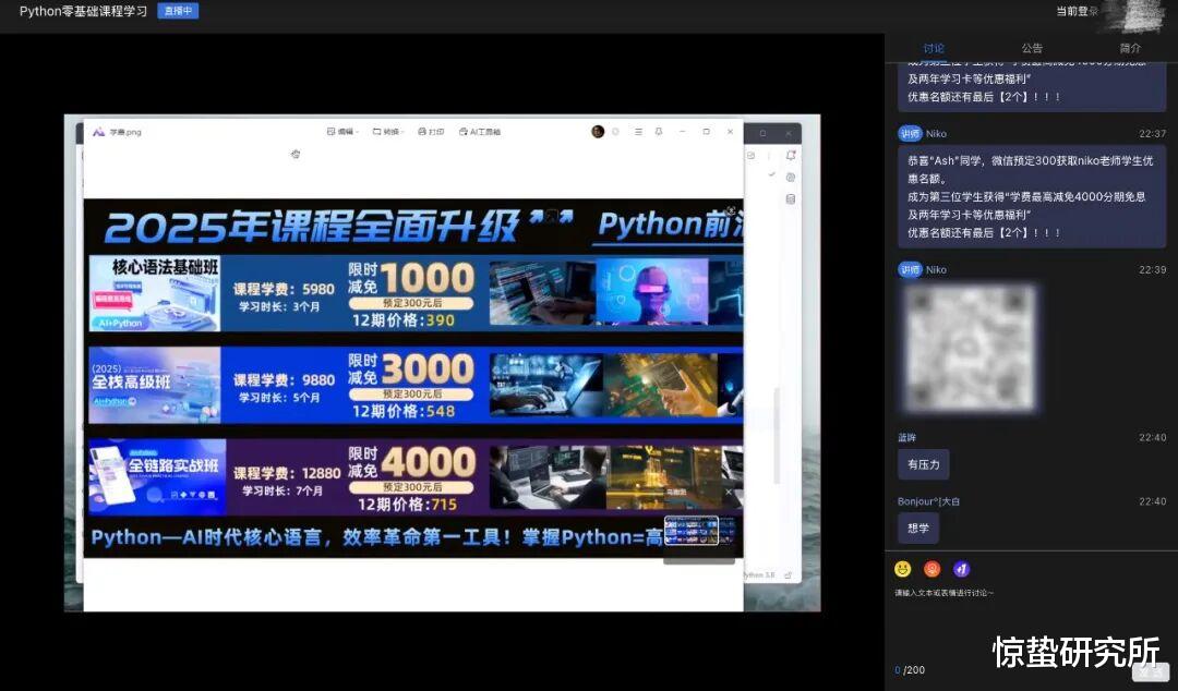 值得注意的是,惊蛰研究所在听课时主动提出了3个问题,但均未得到主讲人的在线回复。同时,课程海报上的时间赫然写的是“2025年”,因此惊蛰研究所推测,这堂2小时Python培训课并不是实时直播,而是一场提前录好的“伪直播课”。