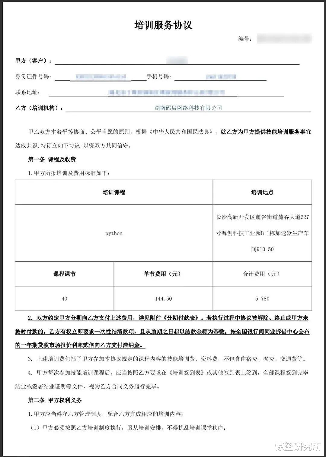 “我当时跟被洗脑了一样,交了100元定金。”小文告诉惊蛰研究所,交完定金后,他接到对方的电话,被引导着一步步操作。对方介绍了5888元和7888元两种课程,又说:“你是学生,不用担心太贵,可以分12期,平均一个月才400多元,每天也就十几块钱。后面学得差不多了,可以在网上接兼职赚学费。”听到这里,小文心动了。“对方多次强调这个不是贷款,就是个分期协议,我就弄了。”