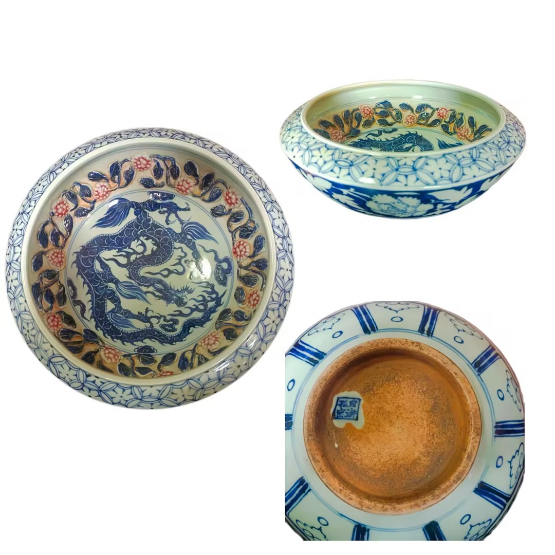 纹饰的延伸:笔洗的外壁也绘有缠枝莲纹,与内壁的龙纹形成 “内外呼应”—— 这让笔洗不仅是 “实用器”,更是 “书案装饰器”。