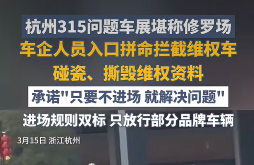 与此同时,面对问题车展,车企也有了自己的“对策”。杭州车展现场,有车企人员用“躺地碰瓷”的方式拦截维权车辆;武汉车展上,有品牌方人员当场撕毁维权告知单;还有媒体爆料,有车企提前三天就守在展会附近,生怕出现维权状况;更有极端的是,有车主在维权时,车辆被厂家远程锁死、无法正常使用。杭州车展也因为车企的不断阻挠,前后被迫四次更换举办地点。