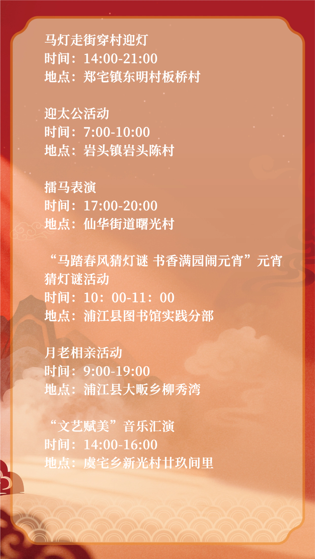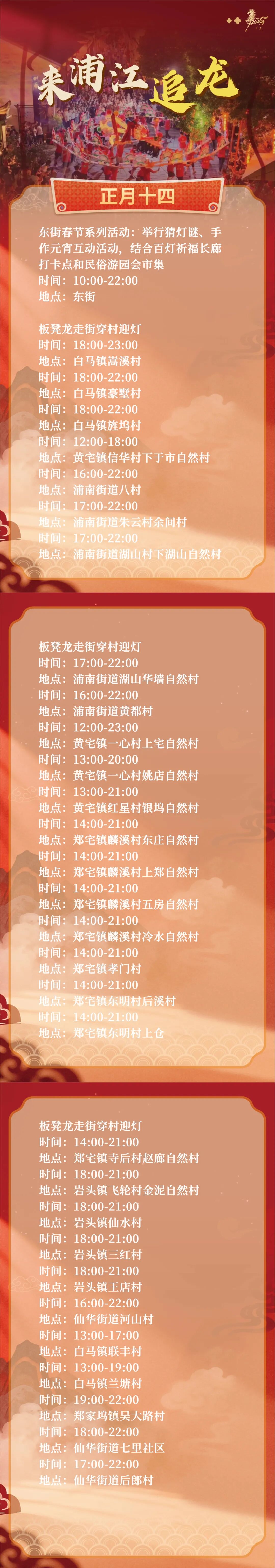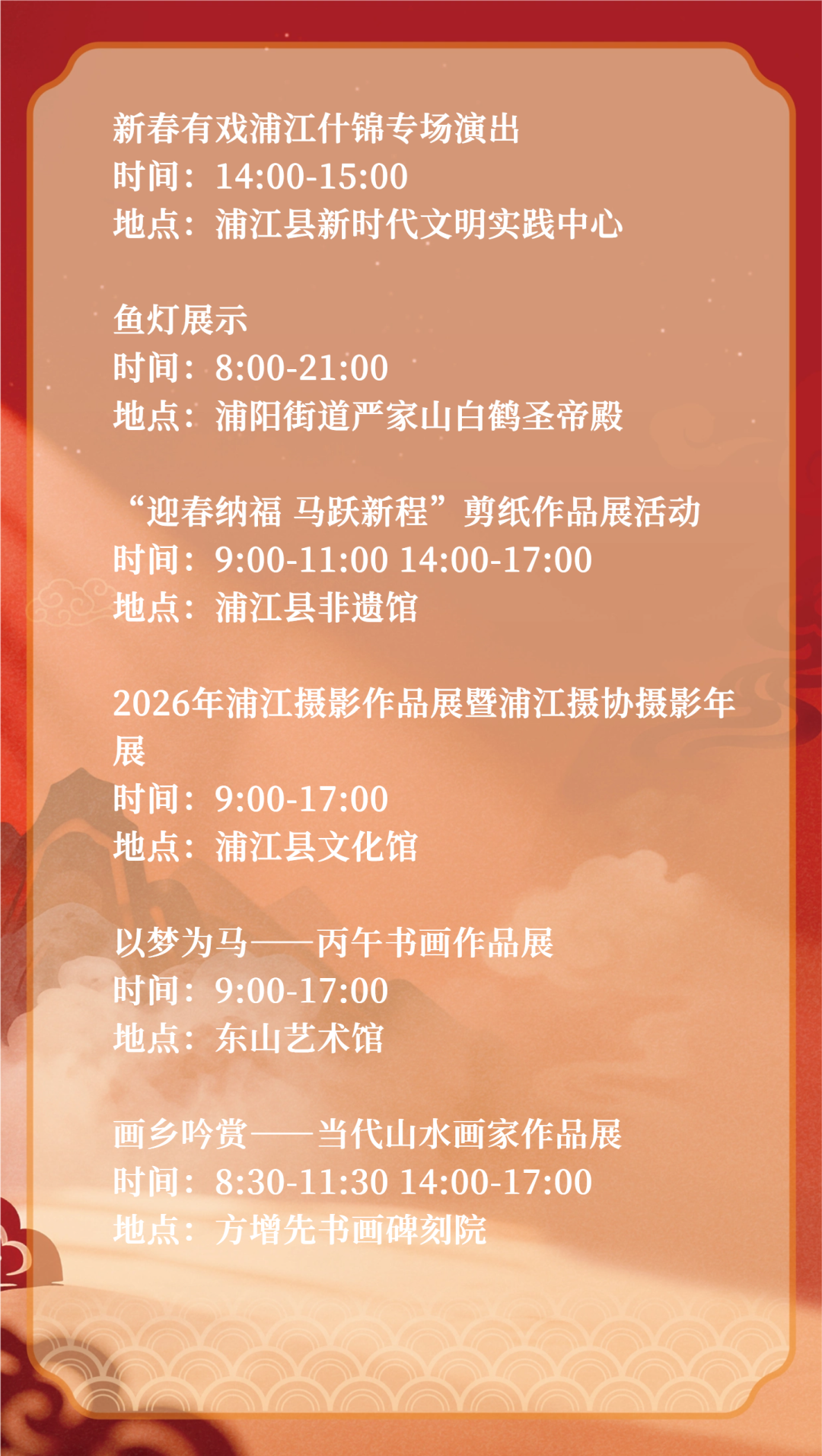 龙腾浦江,灯火万家!今年春节,浦江为您铺开一幅活色生香的年俗长卷——从东街古巷里人气龙灯踏夜巡游的流光溢彩,到全县板凳龙首次“大比舞”的锣鼓喧天,再到深入乡村“追龙”打卡的烟火气息,牛清汤的暖意、米筛爬的筋道,更让年味有滋有味。即日起,我们将按日历每天推送当日精彩活动,请您收好这张活动日历卡片,日日有戏、处处可玩,跟随我们的指引,一起在浦江过个地地道道、热热闹闹的中国年!
