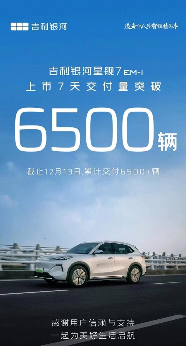 今日,吉利汽车宣布:吉利银河星舰7 EM-i,上市7天交付超6500台!新车已于一周前的12月6日正式上市。