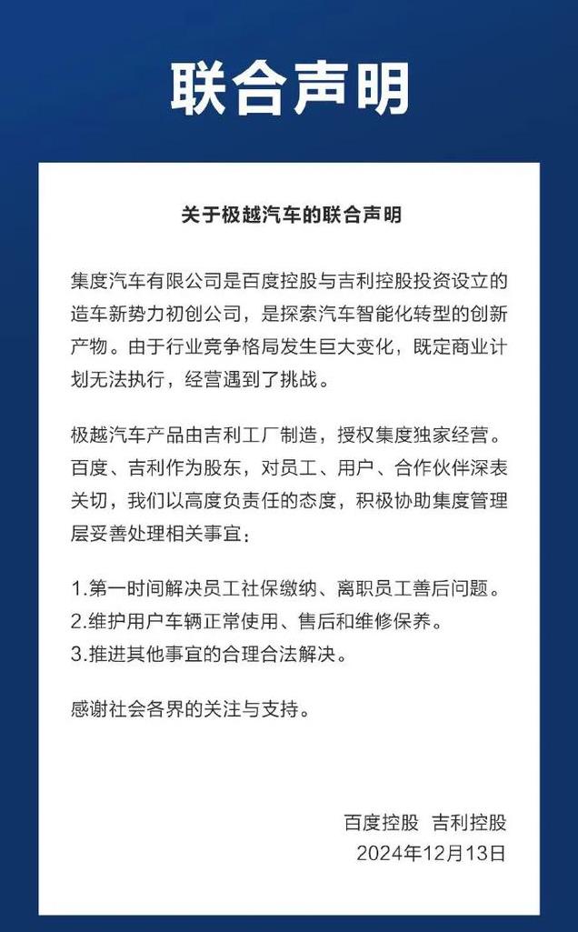 昨日,百度控股和吉利控股关于极越汽车现状发布了联合声明。