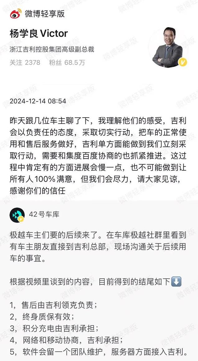浙江吉利控股集团高级副总裁杨学良也在微博上公开?回应:吉利会以负责任的态度,采取切实行动,把车的正常使用和售后服务做好,吉利单方面能做到我们立刻采取行动,需要和集度百度协商的也抓紧推进。这过程中肯定有的方面进展会慢一点,也不可能做到让所有人100%满意,但我们会尽力,请大家见谅,感谢你们的信任!