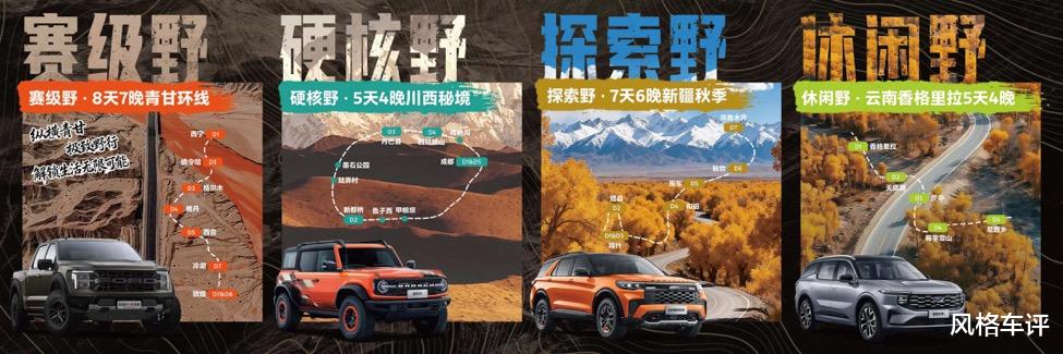 与此同时,福特手握三大王牌:覆盖全动力场景的丰富产品矩阵,从路上延伸至目的地的沉浸式体验,以及由全球视野与本地社群共同构筑的深厚探险文化。以 “四级野”(赛级野、硬核野、探索野、休闲野)深度诠释品牌“探索/野行”的品牌定位,精准定义不同层级的用户需求、产品能力与应用场景,激发每一种天性,为每一次出发做好准备。