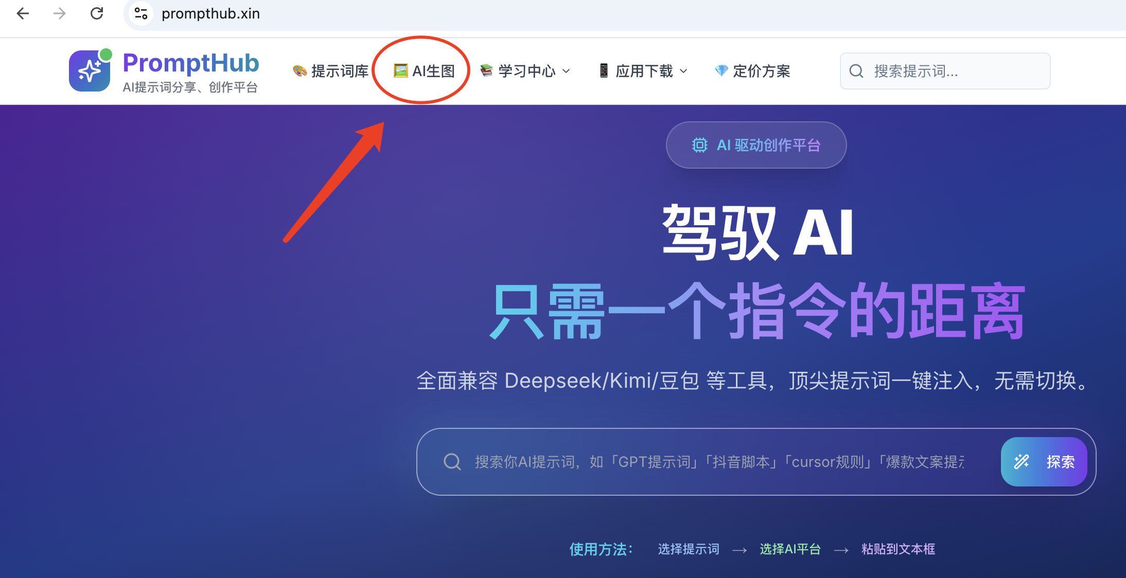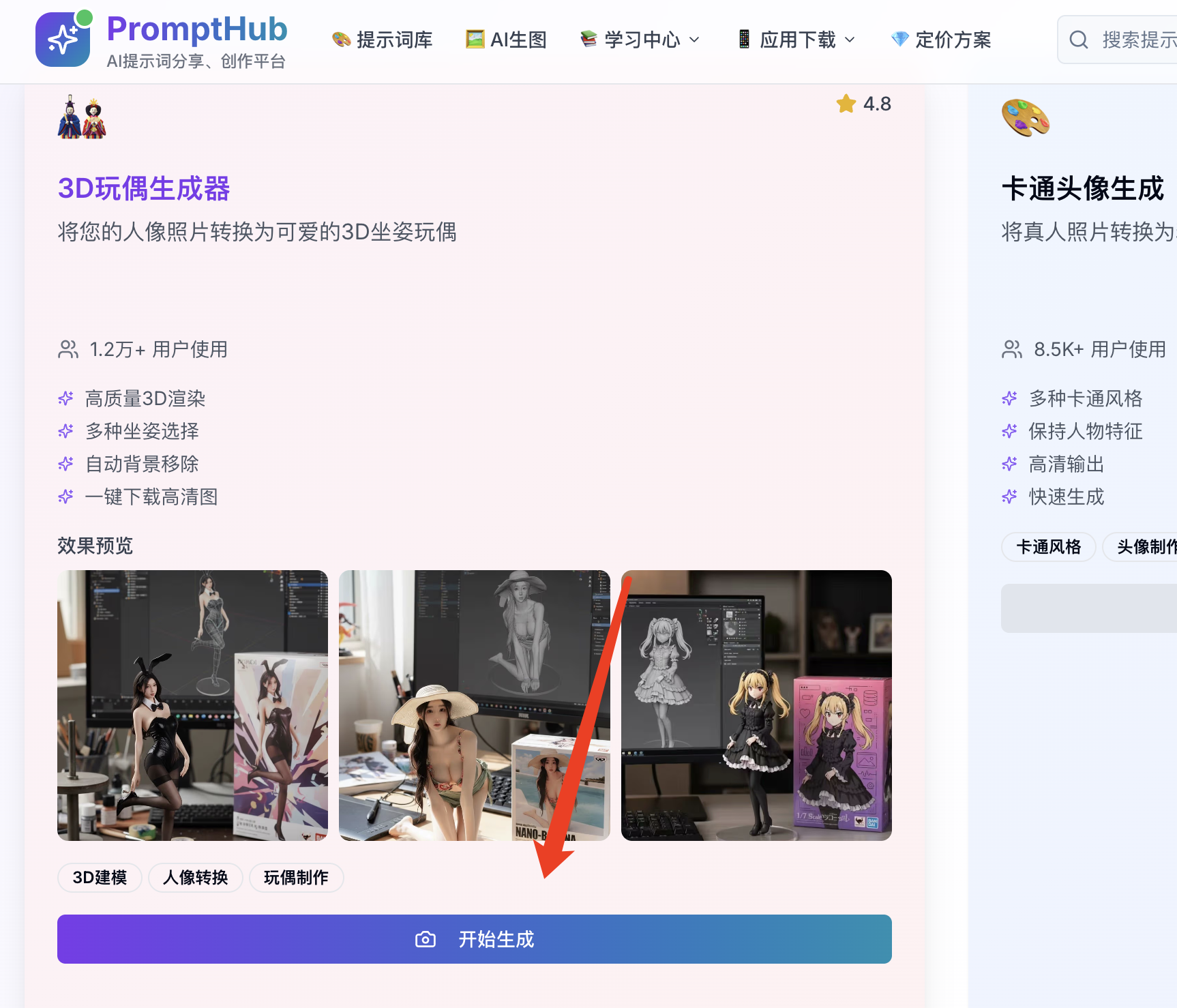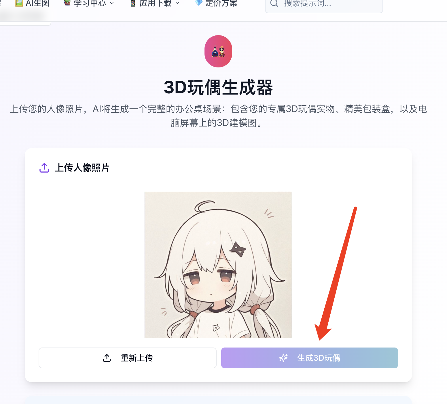 打开网站,在顶部导航栏找到“AI生图”,鼠标放上去,在下拉菜单里点击“3D玩偶生成器”。(跟着红圈点就行了)