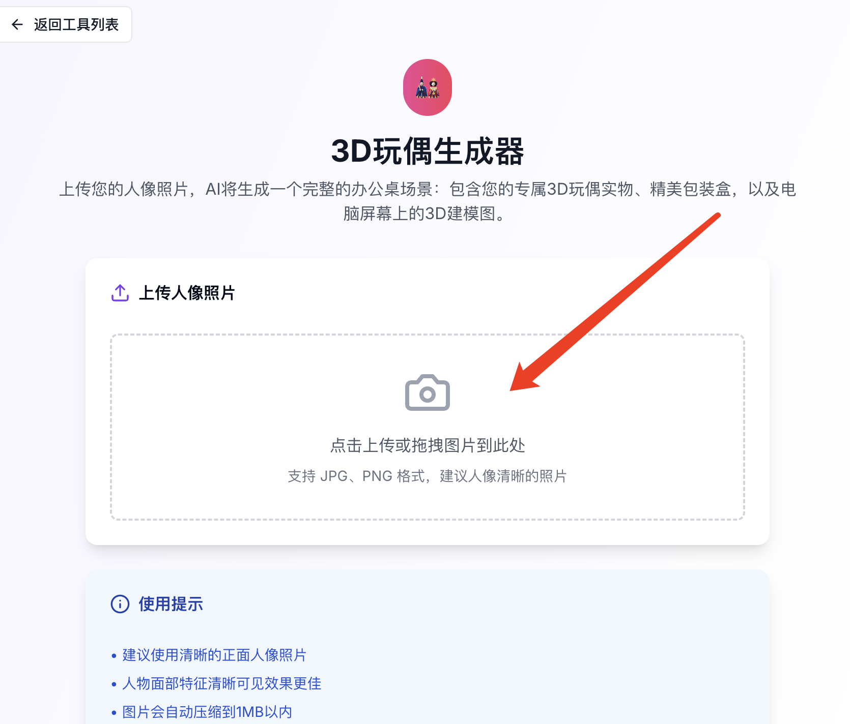 点进去后,会看到一个简洁的上传页面。把你准备好的照片,拖拽或者点击上传。