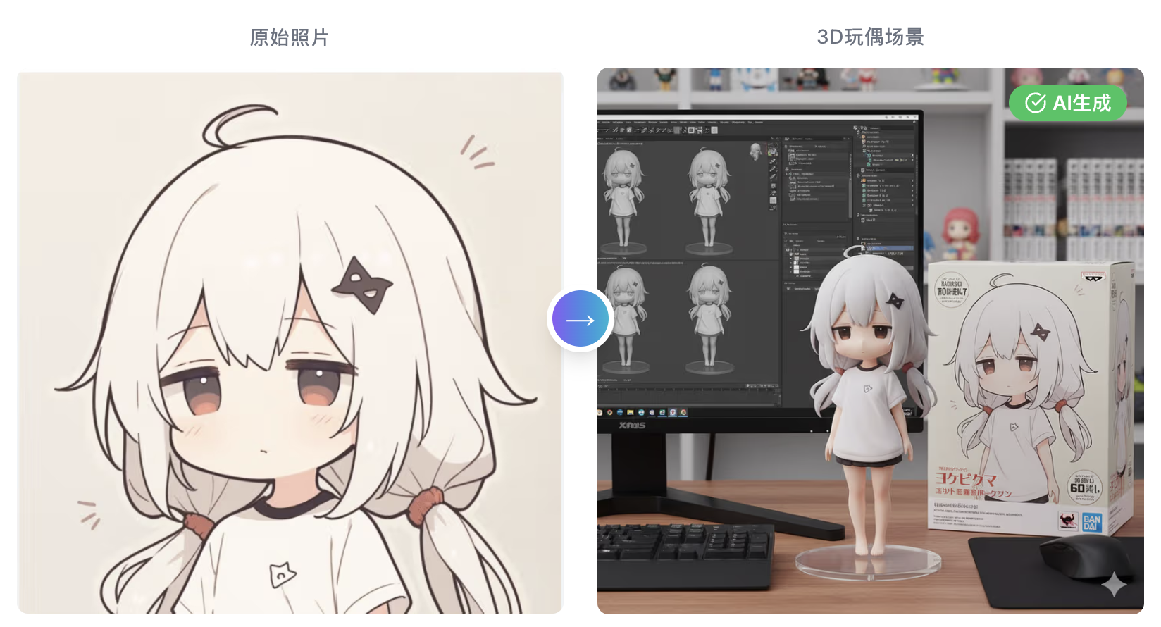 一、先看效果图,有被惊艳到了吗?上次我看到有人把生活照做成了手办,特别棒!而且还会修饰身材!把你的超美的照片上传上去,立刻生成精致桌面玩偶手办,做一个9宫格发一个朋友圈,是不是特别吸引人!