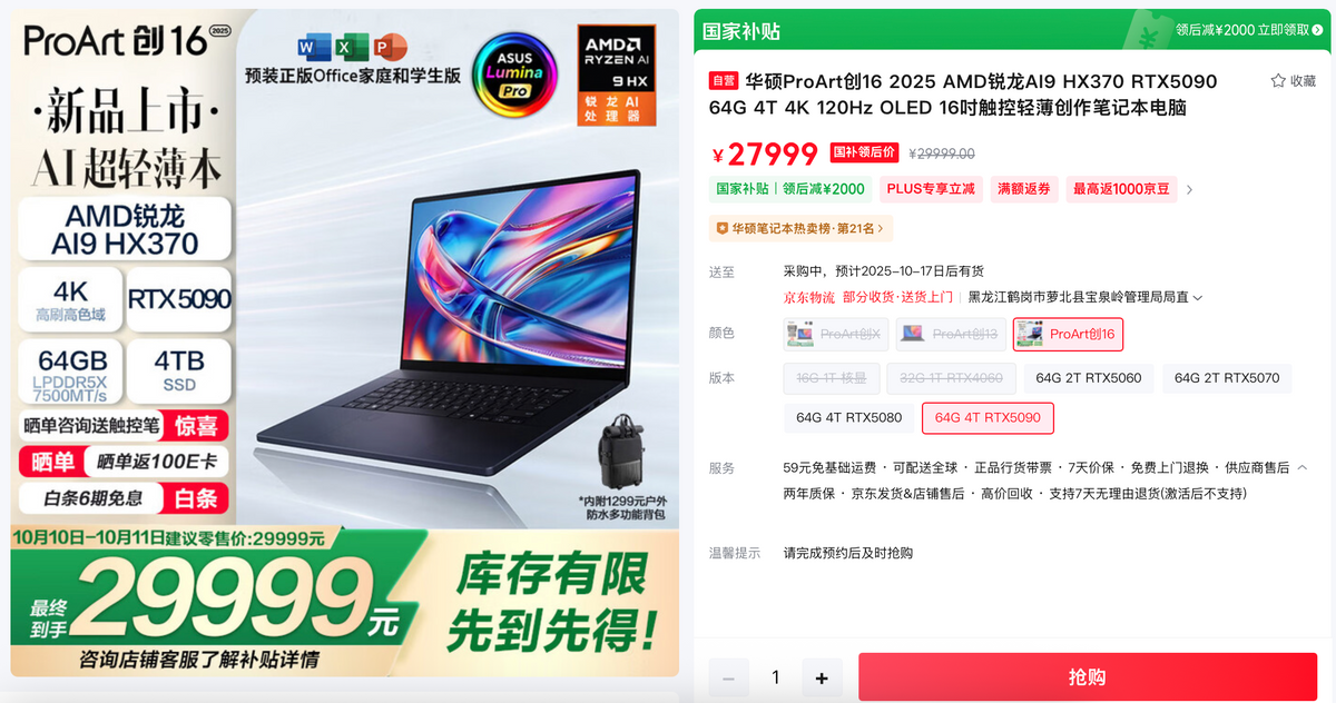 对追求精准、高效的创作者来说,一台好的工具能让创意少受硬件限制,华硕ProArt 创16 2025拥有旗舰性能、专业好屏和一系列AI辅助,扛住各类高负载创作任务,让创意落地的每一步都更高效,更把单纯的移动工作站变为创意加速器。目前这款新机已在华硕京东自营官方旗舰店正式开售,可选RTX 5080 / 5090版本,部分地区可领至高20%国家补贴(活动详情可咨询客服)。想升级创作装备的朋友们,可以上京东搜索#华硕ProArt 创16 2025#了解更多详情。
