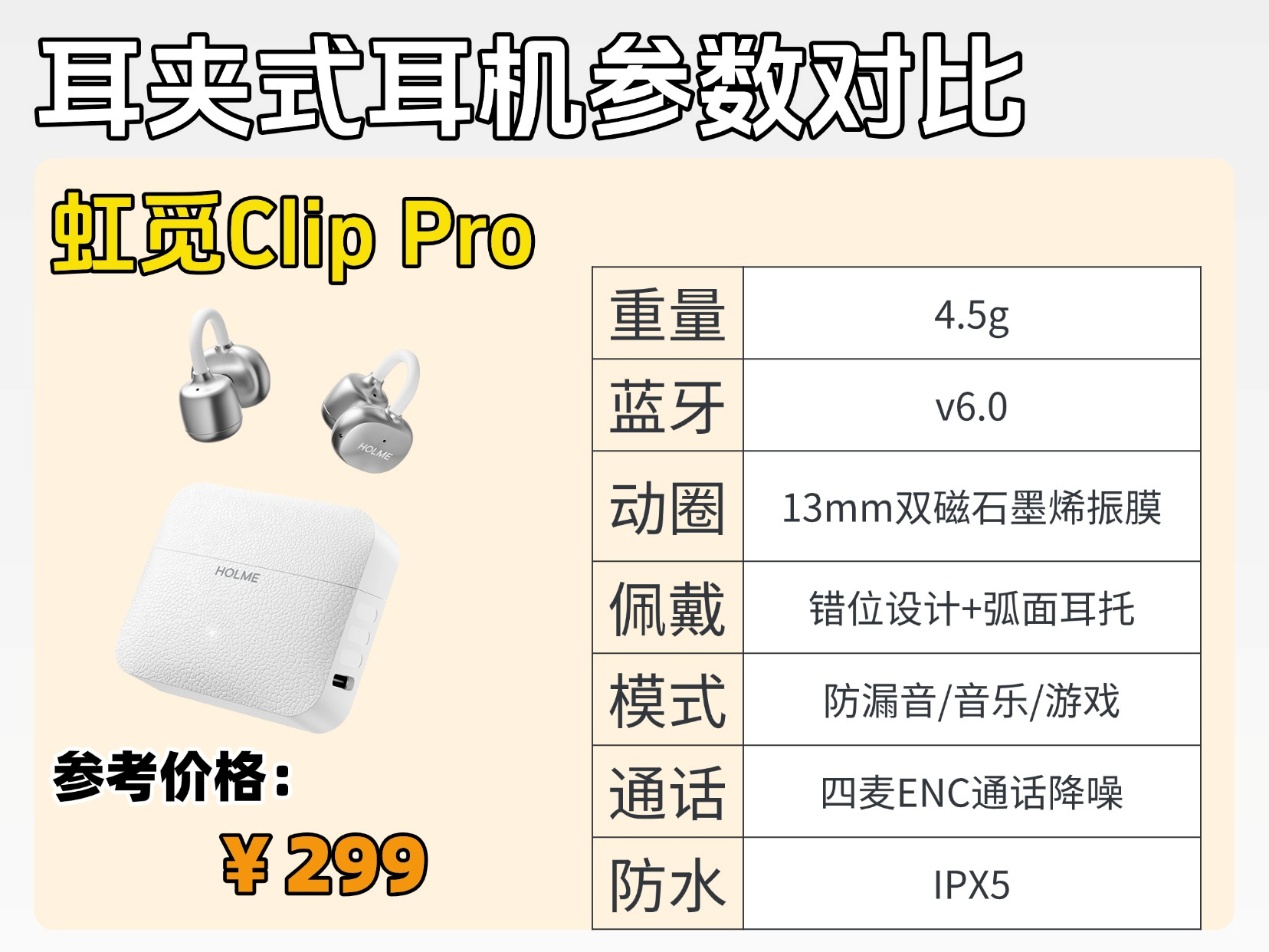 首先重点说虹觅Clip Pro,这款耳机的性价比和性能表现都远超同价位的耳夹式耳机,体验感完全不输于更高价位的耳机。它搭载的是蓝牙6.0芯片,实际用下来,连接挺快的,基本上都做到了开机秒连,还支持支持智能一拖二功能,手机和平板之间切换时十分顺滑,,不用反复配对。单耳4.5g戴久了也没负担,综合续航32小时,日常通勤一周一充完全够用。IPX5防水能应对运动出汗和小雨,四麦ENC降噪在户外打电话时,能有效过滤车流声,最后就是它自研的防漏音技术也很贴心,公共场合听歌不会打扰别人。关键它只要299元,这个配置能有这样的体验,性价比直接拉满,小白闭眼冲不踩坑。