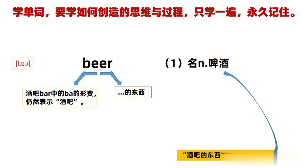 “beer啤酒”这个词的创造,大家首先要知道西方人在酒吧喝的东西一般是啤酒,因此他们将“啤酒”描绘成“酒吧的东西”!因此我们可以将“酒吧bar”中的ba的形变成be,仍然表示“酒吧”。然后后面加一个“...东西”的“er”即可!其实在西方古人头脑中已经明确后面要有er,因此将“bar酒吧”截取成“ba”,然后再变形成“be”。详细解说图如下: