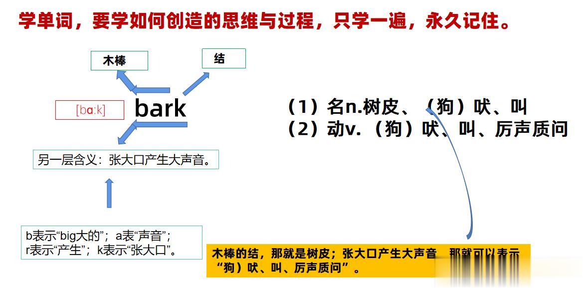 比如“树皮bark”,“bark”中“bar”我们可以当作“木棒”,k可以表示“结”,这样“bark”就表示“木棒的结”那就是树皮!也就是说只要我们会“bar木棒”,知道字母k可以表示“结”,这个单词就可以进入我们意识层面牢记!而非简单存储记忆,只要我们需要使用这个单词,我们的意识层会闪电般的将这个单词推到我们眼前,这样我们的口语就不会结结巴巴,听力不会跟不上节奏!