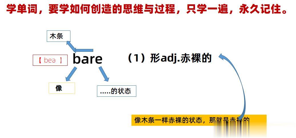“赤裸的bare”为什么里面有“bar”?“木条”大家都知道,从里到外是一样的,外面没有进行装饰,因此西方古人认为“木条”是“赤裸的”。因此创造“赤裸的bare”这个单词时,借用“木条bar”来完成!只需要描述“像木条一样赤裸的状态”这句话,这个单词就可准确创造出来。详细解说图如下: