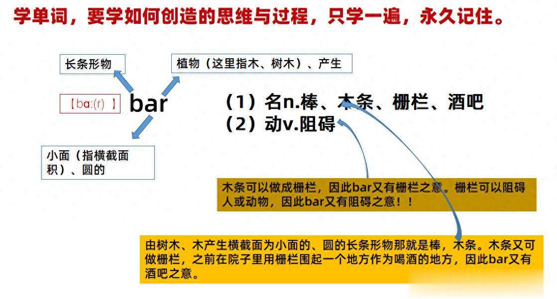 通过简单观察大家应该发现这么多单词里有“bar”这个单词或有这个单词的影子!这说明这些单词是基于“bar”这个单词创造的!因此我们要想牢记这些单词,应该牢牢掌握“bar”这个单词!