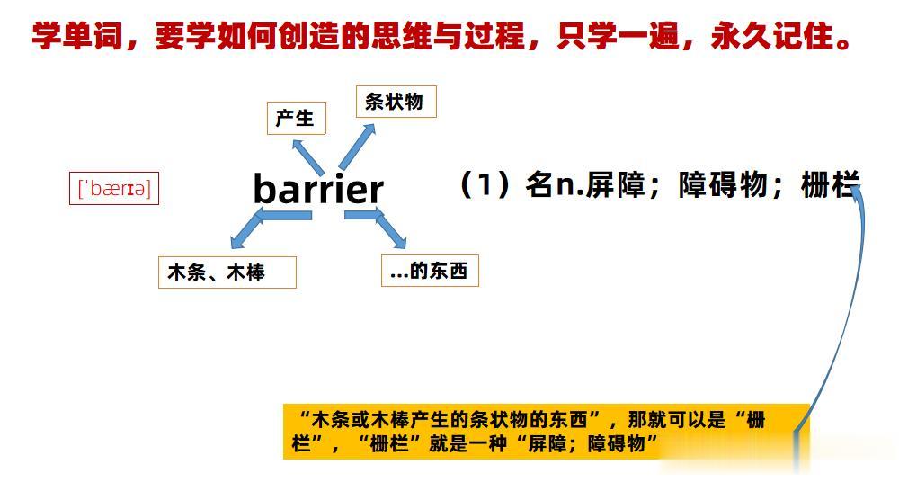 “barrier 屏障;障碍物;栅栏”的第一含义是“栅栏”,由“栅栏”含义可以引申出“屏障;障碍物”!只要大家知道“栅栏”一般情况就是用“木棒或木条”产生的“条状物”的东西!那么这个单词就可以被创造出来了,大家认真阅读解说图,大家可以找到“用“木棒或木条”产生的“条状物”的东西”这句话中的每个表达!