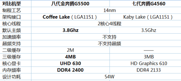 内存频率,G5500支持DDR4 2400的内存,G4560支持到2133,这点差异反应到性能上基本没什么差距。