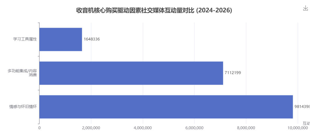 消费者购买收音机的核心驱动因素呈现多维度特征,其中情感与怀旧情怀的驱动力尤为显著,在社交媒体上引发了近千万次互动。多功能集成与内容消费紧随其后,而学习工具属性也占据了重要一席之地。