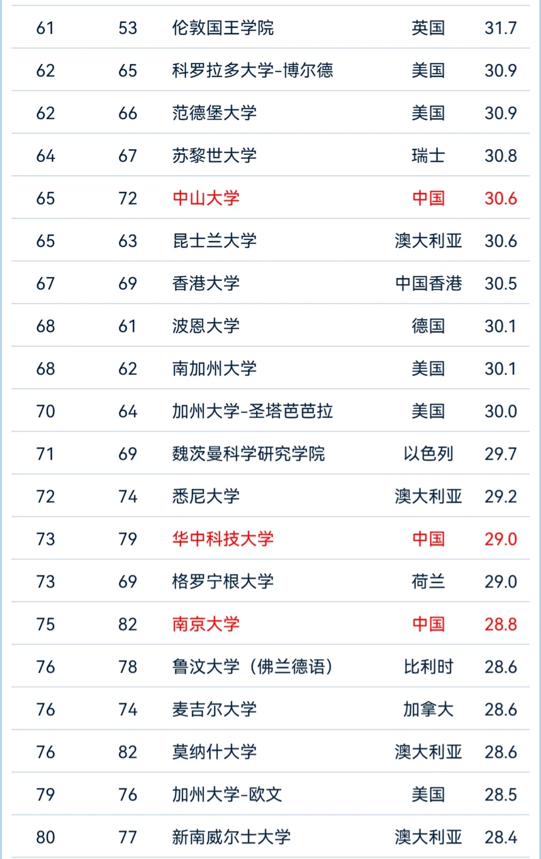 在前100名的高校中,中国大陆有13所大学入榜,分别是清华大学、北京大学、浙江大学、上海交通大学、中国科学技术大学、复旦大学、中山大学、华中科技大学、南京大学、武汉大学、四川大学、西安交通大学和中南大学,其中,清华是首次跻身世界前20,在亚洲排在第一位。