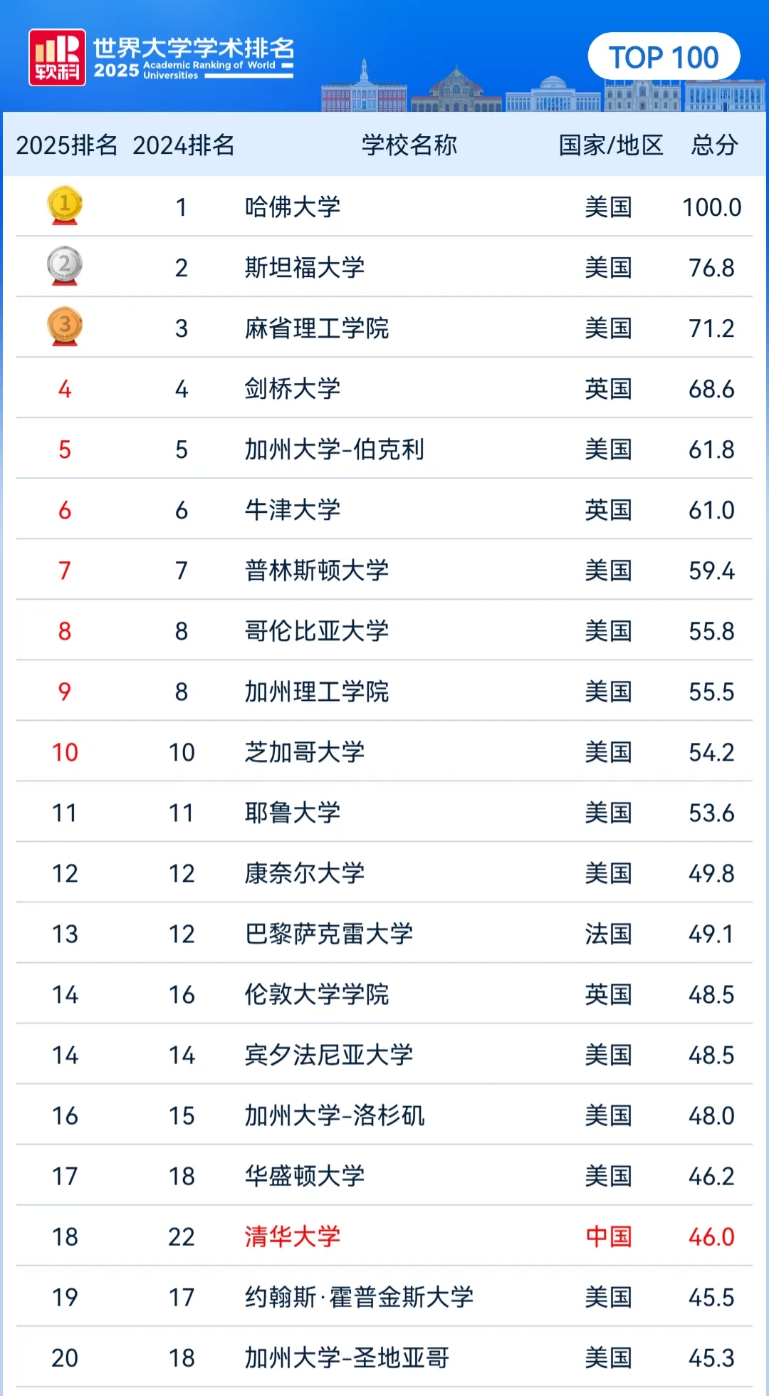 软科世界大学学术排名发布,排名前三的高校分别是哈佛大学、斯坦福大学和麻省理工学院,哈佛大学已经是连续23年稳坐第一的宝座。