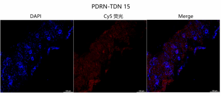 透皮验证:在小鼠离体皮肤渗透实验中,Cy5荧光标记的PDRN-TDN15显示出强大的透皮能力,能均匀分布于皮肤并抵达真皮层;而对照组的单链ssDNA则基本被阻挡在毛囊口,无法渗透。