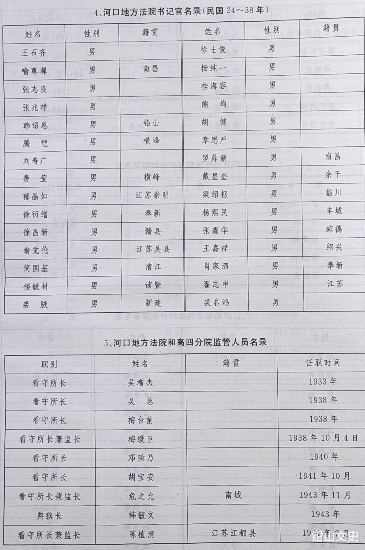 26年(1937)1月27日,江西高等法院第四分院院长廖江南离任,邱珍接任。7月1日,罗赞铎接任河口地方法院推事兼任院长。9月,河口监所协进委员会成立,王玉麒任主任委员。