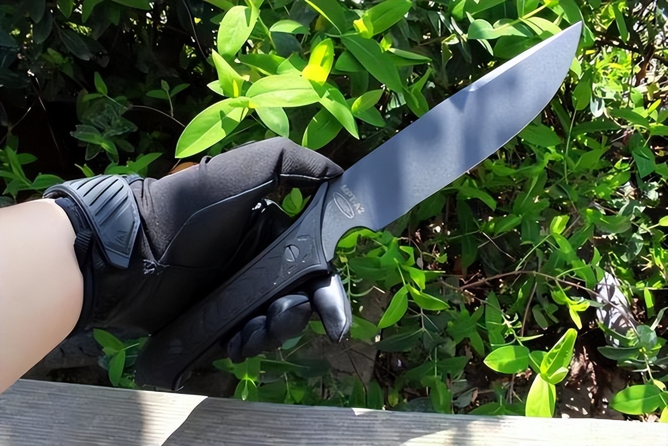 刀背和刀刃根部的设计同样体现了该刀的实用性。刀背和刀刃根部都设有锯齿,这些锯齿可以用来锯断绳索、木条等物品。在野外生存或者执行任务过程中,经常会遇到需要切断绳索或者处理木条搭建简易设施的情况,此时刀背上的锯齿就能够发挥巨大的作用。刀刃根部还特意设计了食指指槽,这样的设计使得拇指和食指可以更靠前地握持刀具,从而对运刀的控制更加精细。