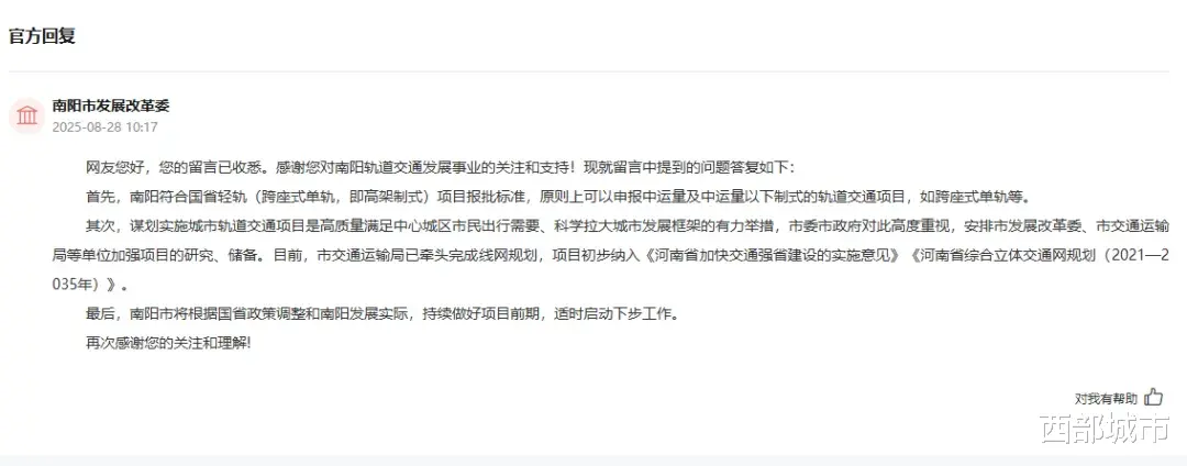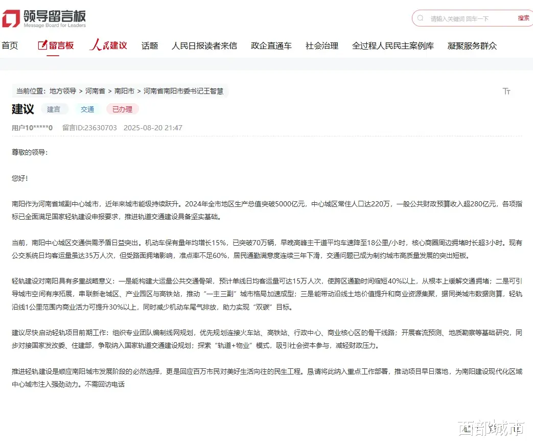 近日有媒体报道,南阳一网友通过人民网“领导留言板”建议推进轻轨建设,获得了官方积极回应。