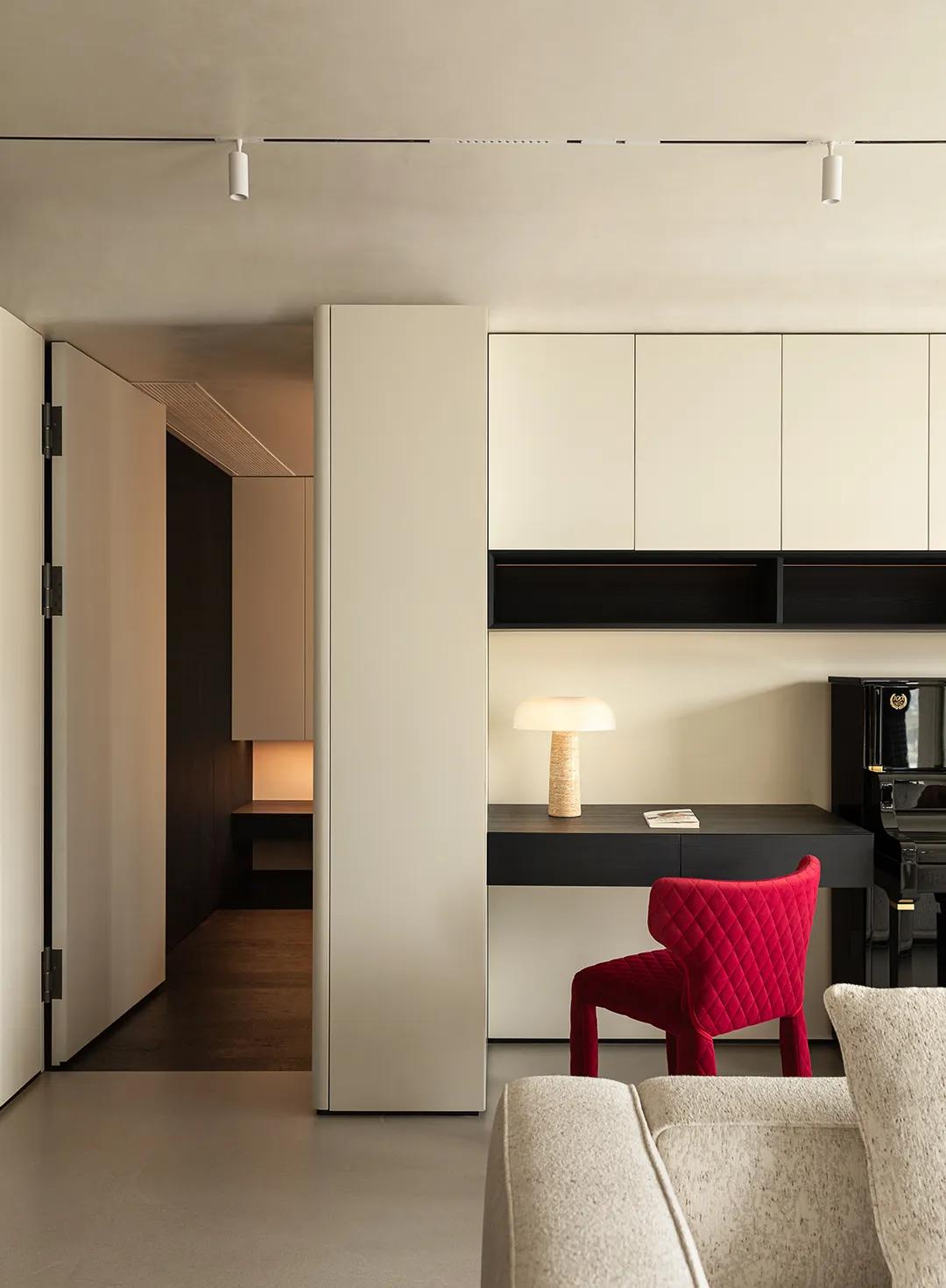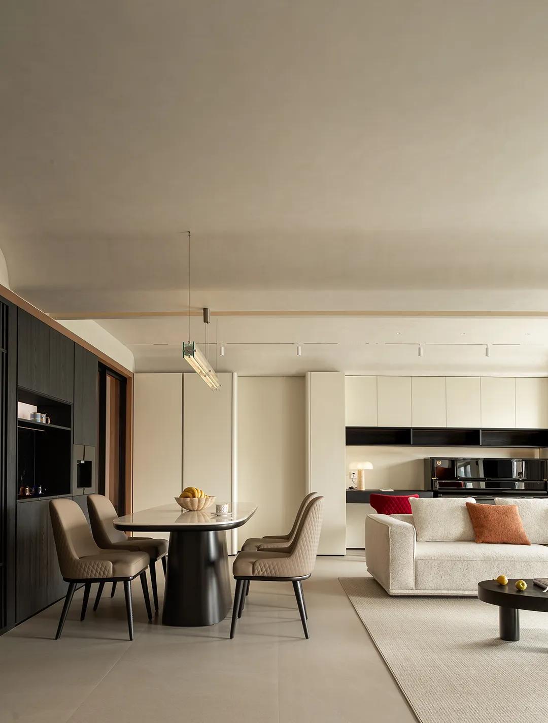 餐厨区的细节处理,米白色混油木饰面的亮色调,让整个区域显得通透而清爽,它与金属材质的克制运用、石材的凝练质感交织在一起,形成了一种极具层次的美学表达。