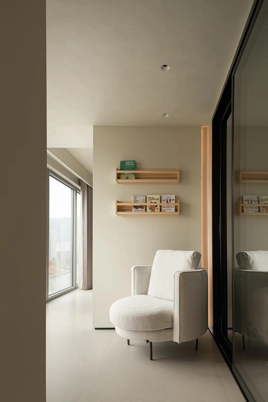 阳台的复合利用,为居住者留下了与自然对话的余地。当微风掠过窗纱,湖面的水气似乎也随之氤氲在客厅的角落。这这正是一种真正成熟的审美:在秩序中寻找诗意,在风景中安放日常。