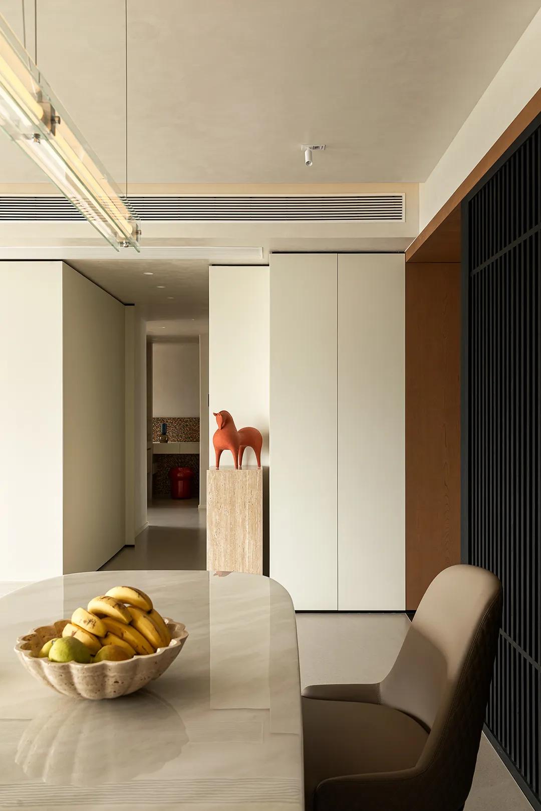 大理石餐桌以其天然的纹理,在灯光下闪烁着静谧的微光,与意式极简餐椅共同构建了一个既高级又松弛的用餐环境。这里不仅是盛放三餐四季的容器,更是家人围坐、分享日常点滴的温情中心。