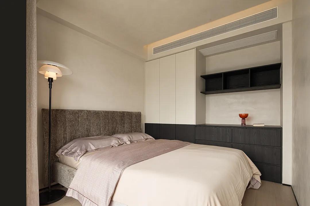 主人房套间的设计,不仅是空间尺度的叠加,更是一套关于私密生活逻辑的深度推演。它将梳洗、更衣、休憩与静思的功能有机整合,形成了一个自给自足的“小世界”。Cassina宽屏床以其克制的几何线条确立了卧室的骨架,而灰色布艺的质感则中和了现代设计的冷峻。