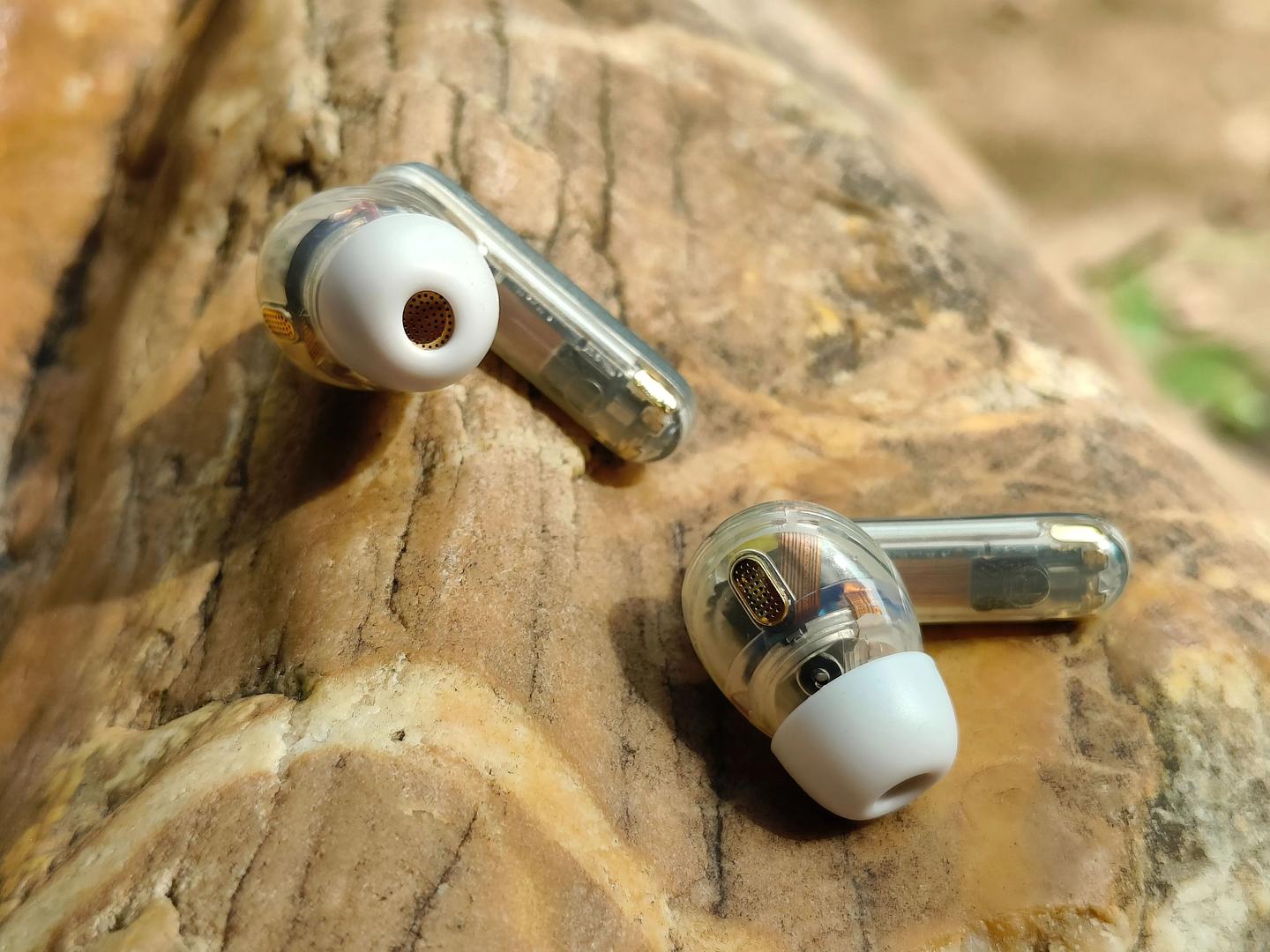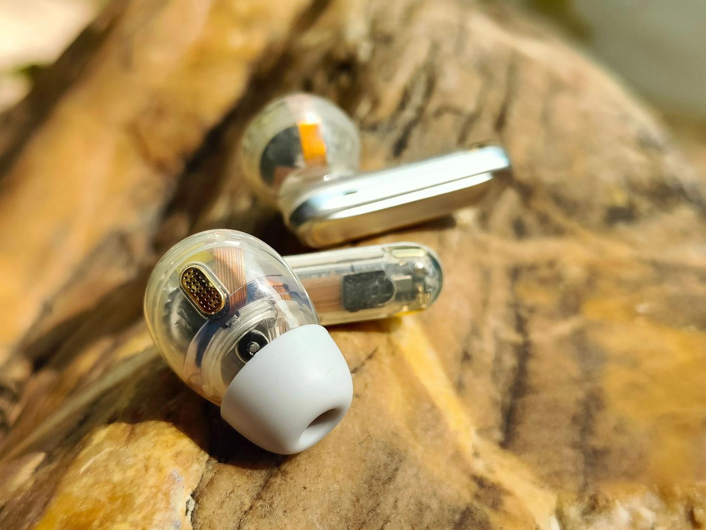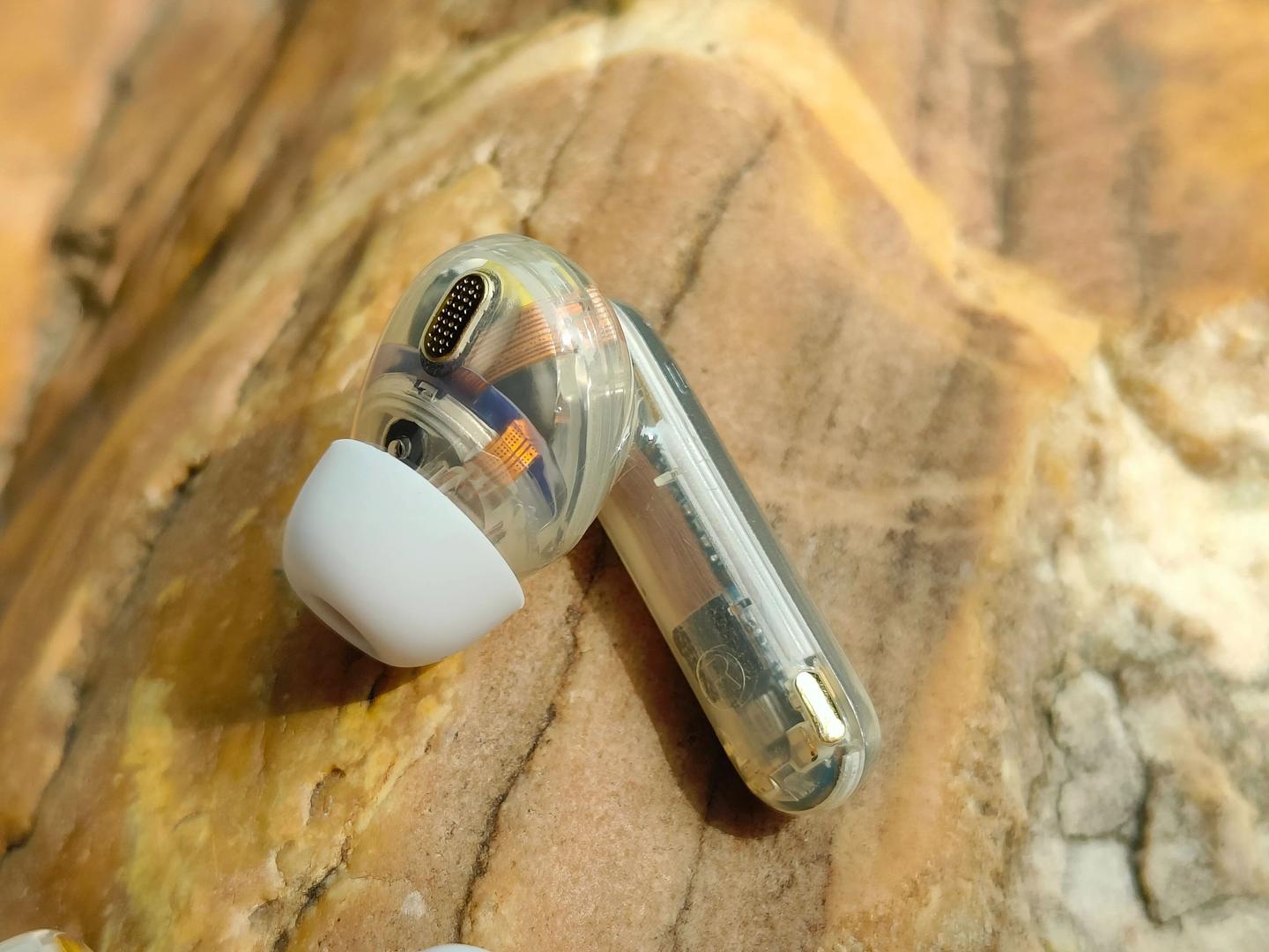 半身透明耳机壳设计,内部声学结构一目了然,拿在手里非常的有辨识度。耳机基于人体工学 3D 建模,完美贴合亚洲人耳型,单耳仅重 4.5 克,戴上几乎无感。