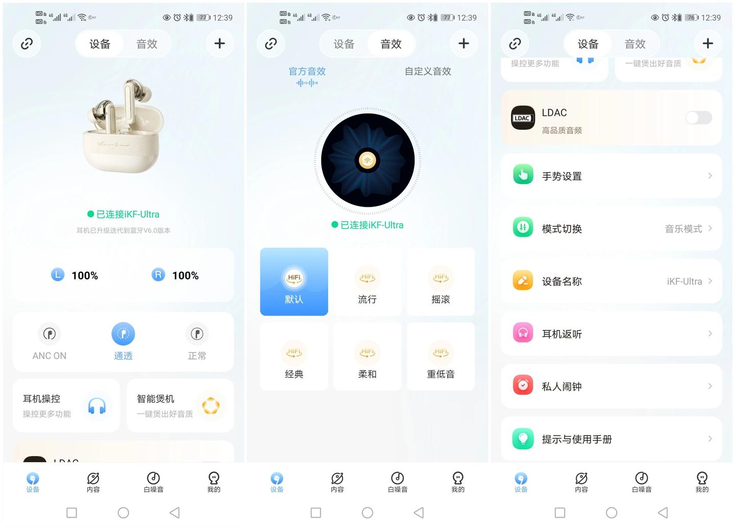 支持 LDAC 无损传输是同价位少有的配置,对比普通耳机,无损音乐的乐器残响、背景细微音效都能精准捕捉,仿佛置身小型演奏厅。通过 iKF APP 还能自定义 EQ 音效,我平时听流行开 “Hi-Fi 模式”,听古典切换 “均衡模式”,满足不同音乐喜好。
