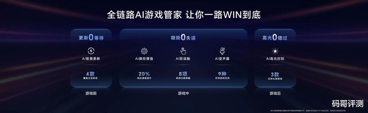 荣耀WIN系列拥有全链路AI游戏管家,带来“AI智慧更新”“AI操控增强”“AI防误触”“AI变声器”“AI高光时刻”等功能,更新0等待、微操0失误、高光0错过,全面提升玩家的电竞体验,一路“WIN”到底。