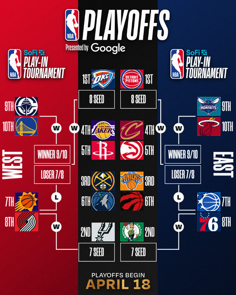 附加赛具体对阵为:76人vs魔术、黄蜂vs热火、太阳vs开拓者、快船vs勇士。