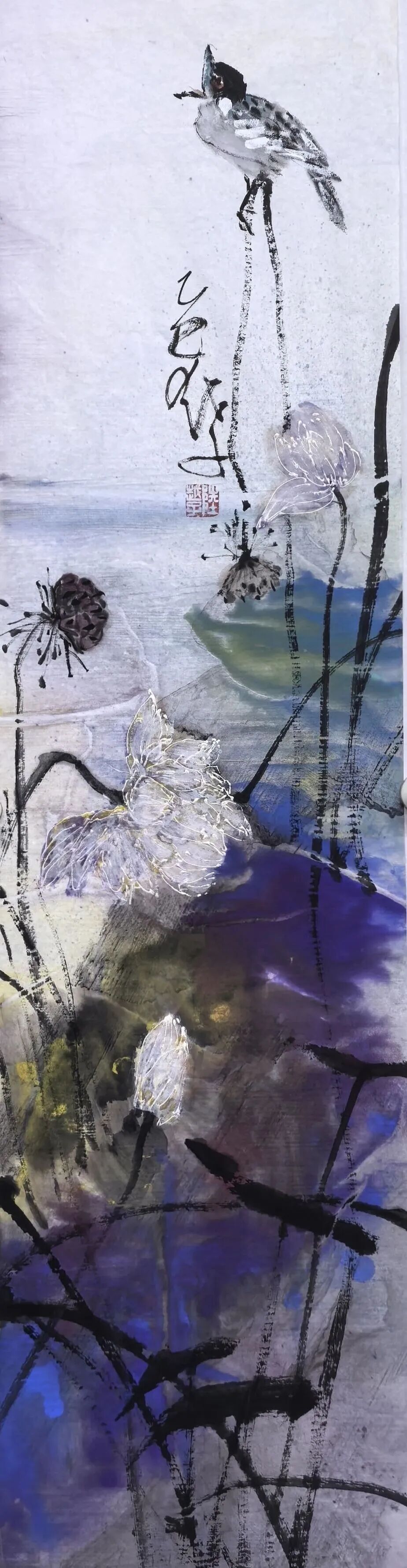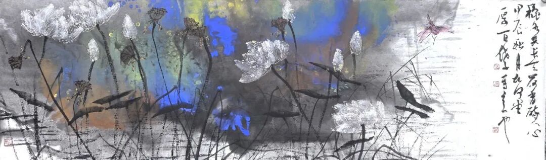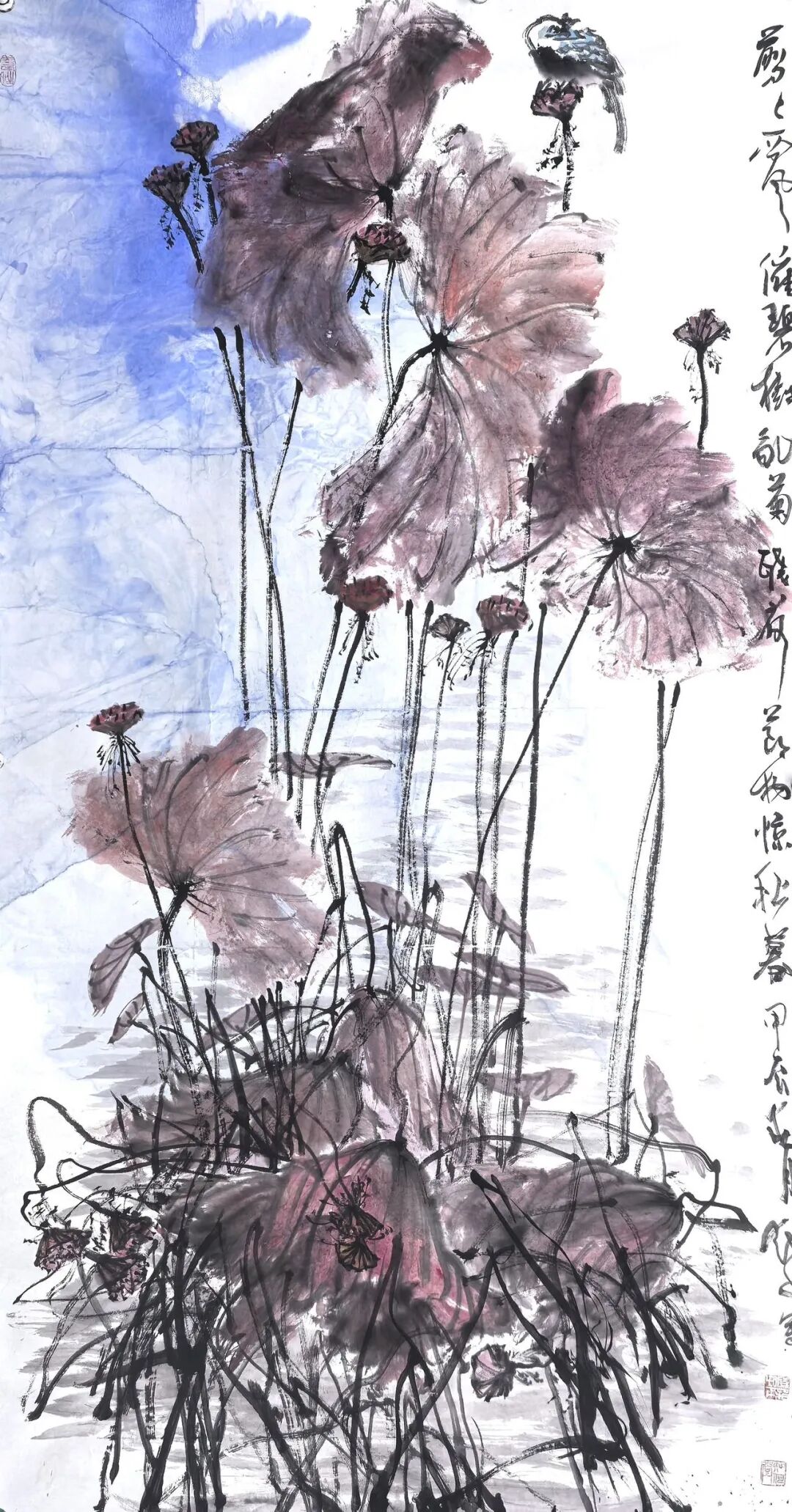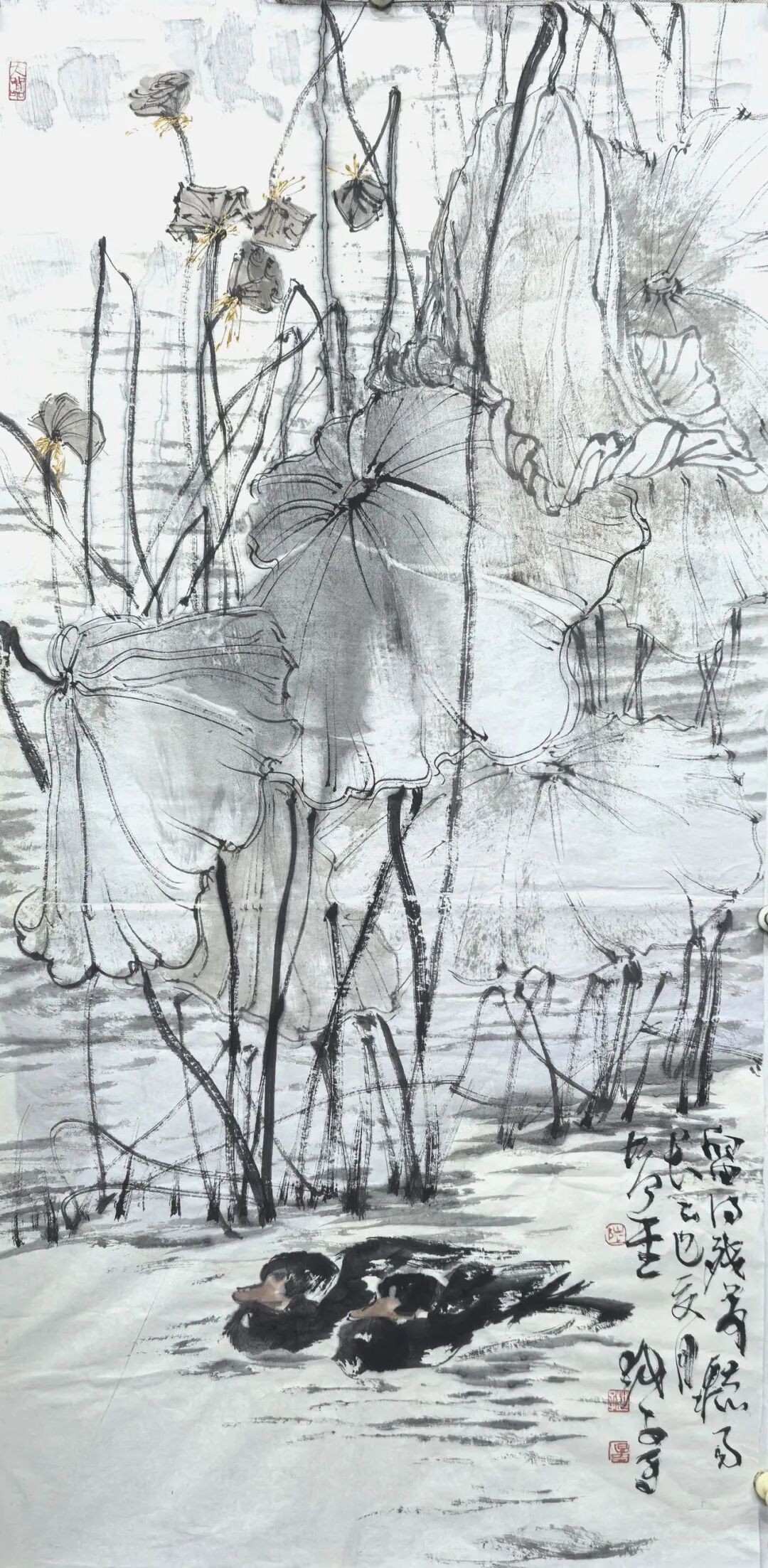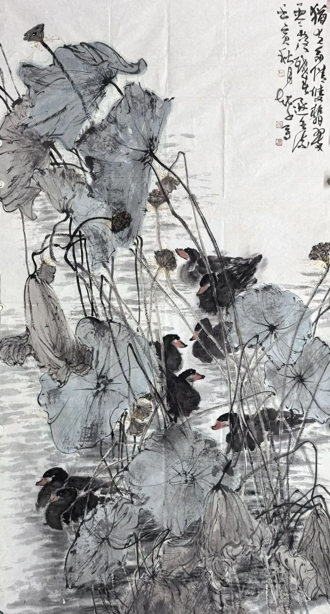 在花鸟画创作上,陆越子先生堪称当代大家。他的作品远师宋元院体画的精工细作,近学明清徐渭、八大山人及吴昌硕的笔墨意趣,最终形成了自己“兼工带写、雅俗共赏”的独特风格。他笔下的花鸟,题材广泛,从雍容华贵的牡丹、傲霜斗雪的梅花,到寻常可见的兰草、竹石、荷塘清趣,皆能信手拈来,意趣盎然。