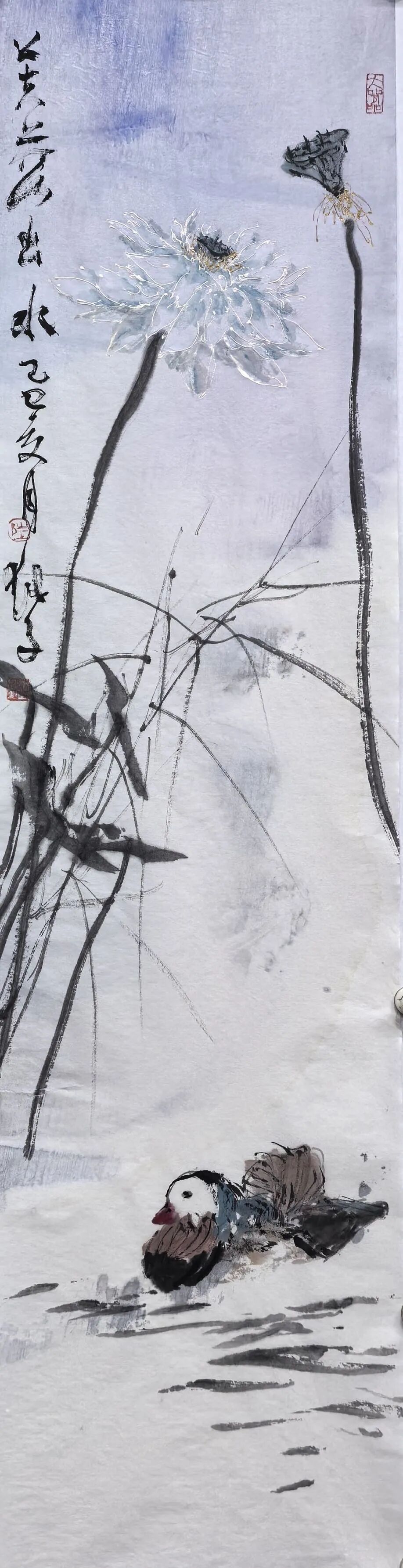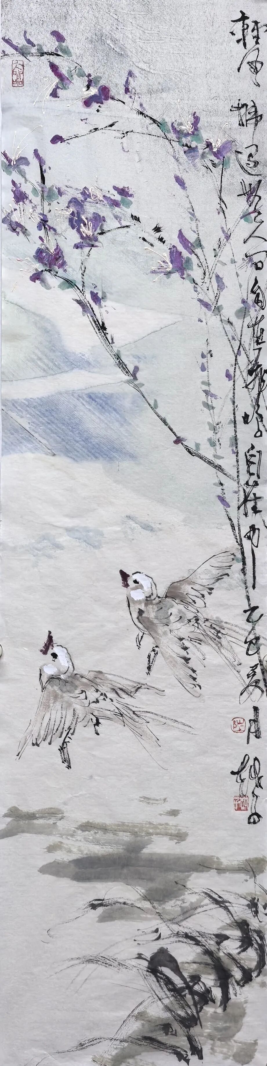 其工笔作品,造型精准,设色清雅,细节刻画入微,花瓣的层次、鸟羽的质感、叶片的脉络,无不精雕细琢,尽显宋人院画的缜密细巧。而写意作品则笔墨奔放,气韵生动,寥寥数笔便能勾勒出花鸟的鲜活神态。他尤擅以书法入画,其题画书法功底深厚,笔力雄健,与画面笔墨相得益彰,增添了作品的文人气息与书卷气。
