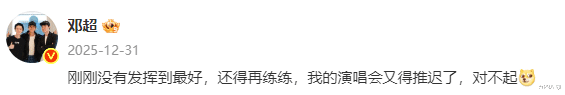 尽管全场气氛很嗨,可邓超并不满意自己的表现,还特意发文道歉,并自嘲“我的演唱会又得推迟了”。