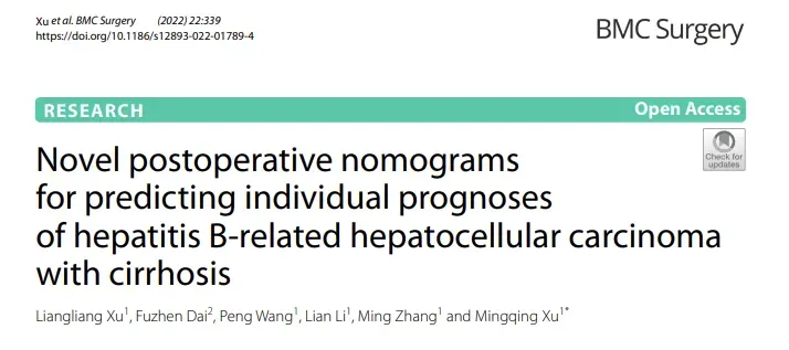 Xu L, Dai F, Wang P, Li L, Zhang M, Xu M. Novel postoperative nomograms for predicting individual prognoses of hepatitis B-related hepatocellular carcinoma with cirrhosis. BMC Surg. 2022 Sep 13;22(1):339.doi: 10.1186/s12893-022-01789-4. PMID: 36100893; PMCID: PMC9472365.
