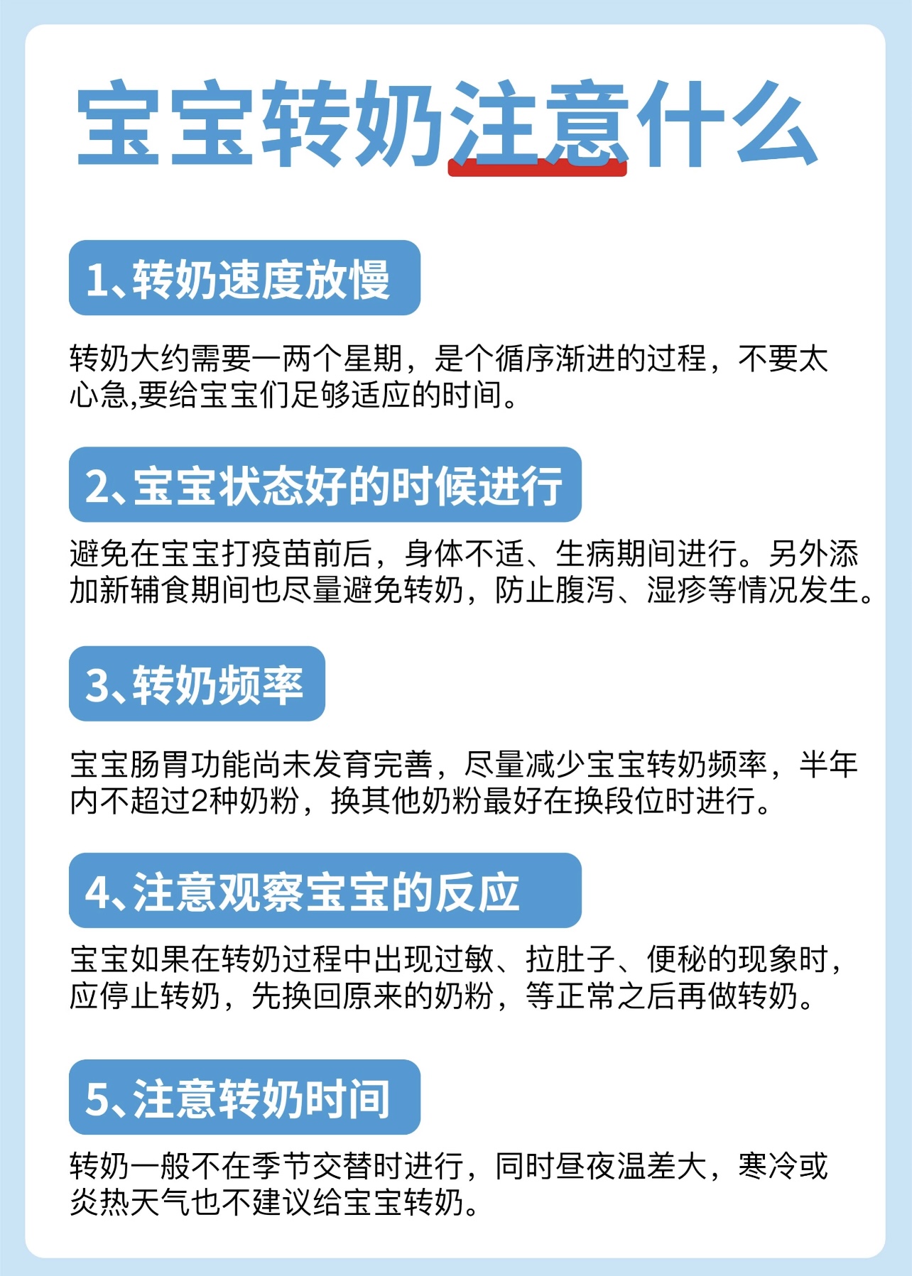 转奶可不是想转就能转的,得挑个“黄道吉日”。首先,宝宝身体得倍儿棒,没有感冒、发烧、腹泻这些小毛病。要是宝宝正生病呢,肠胃功能本来就弱,这时候转奶,就像给生病的战士又增加了新任务,很容易让宝宝身体吃不消。其次,宝宝处于接种疫苗期间也别转奶。疫苗进入宝宝身体后,会引发一系列免疫反应,肠胃功能也会受到影响,等疫苗接种完一周左右,宝宝身体适应了,再转奶也不迟。另外,宝宝换环境、添加新辅食的时候也不适合转奶,等宝宝适应了新环境、新辅食,再考虑转奶的事儿。
