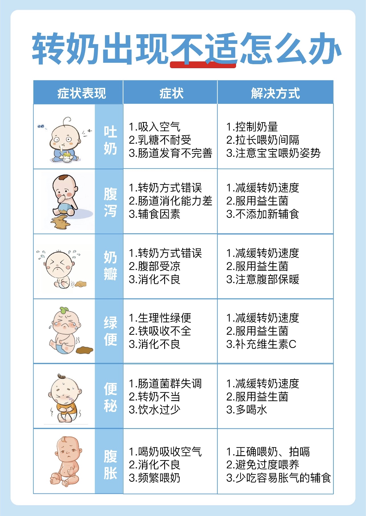 如果宝宝在转奶过程中出现了轻微的不适,比如大便次数稍微增多、大便有点稀,别慌,这可能是宝宝肠胃在适应新奶粉。可以先暂停转奶,继续给宝宝吃旧奶粉,等宝宝肠胃恢复正常后,再按照原来的方法慢慢转奶。要是宝宝不适症状比较严重,出现了呕吐、腹泻、发热等情况,那就要赶紧带宝宝去医院,让医生帮忙看看是不是对新奶粉过敏或者其他原因引起的。