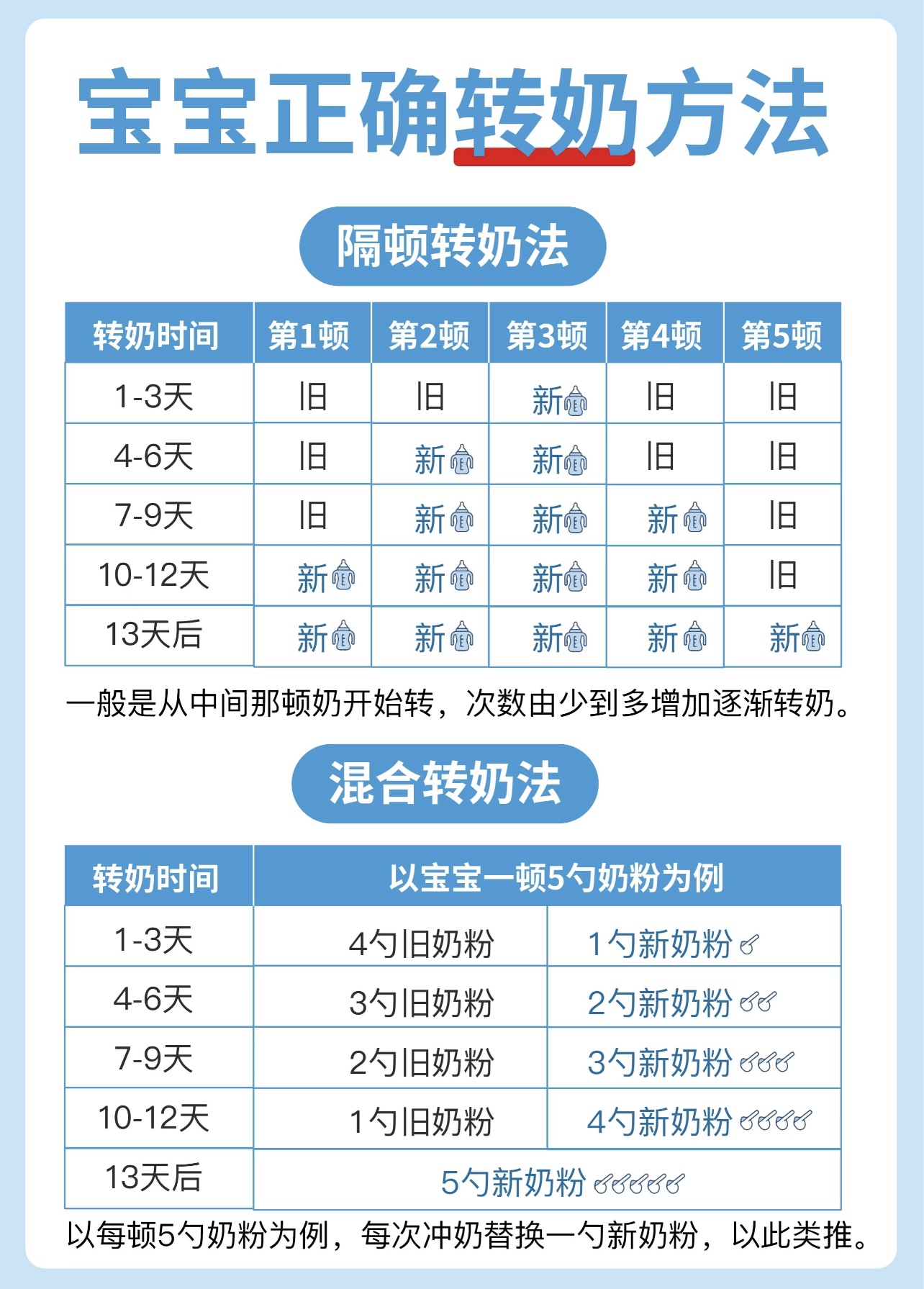 转奶方法主要有两种,一种是隔顿转奶法,另一种是混合转奶法。隔顿转奶法适合母乳转奶粉,或者不同品牌奶粉之间转换。比如宝宝一天吃6顿奶,第一天可以把中午那顿换成新奶粉;观察宝宝没有不良反应后,第三天再把下午那顿也换成新奶粉,以此类推,逐渐增加新奶粉的顿数,直到完全转成新奶粉。这种方法就像给宝宝一个适应新口味的缓冲期,让宝宝的肠胃慢慢接受新奶粉。混合转奶法更适合同品牌不同阶段奶粉转换。先在旧奶粉里加入少量新奶粉,比如旧奶粉和新奶粉的比例是9:1,观察宝宝2 - 3天,如果宝宝没有出现呕吐、腹泻、便秘等不适症状,就可以把比例调整为7:3,再观察几天,接着调整为5:5、3:7,最后过渡到完全用新奶粉。这种方法就像给宝宝的新旧奶粉来一场“温和的融合”,让宝宝的肠胃更容易适应。