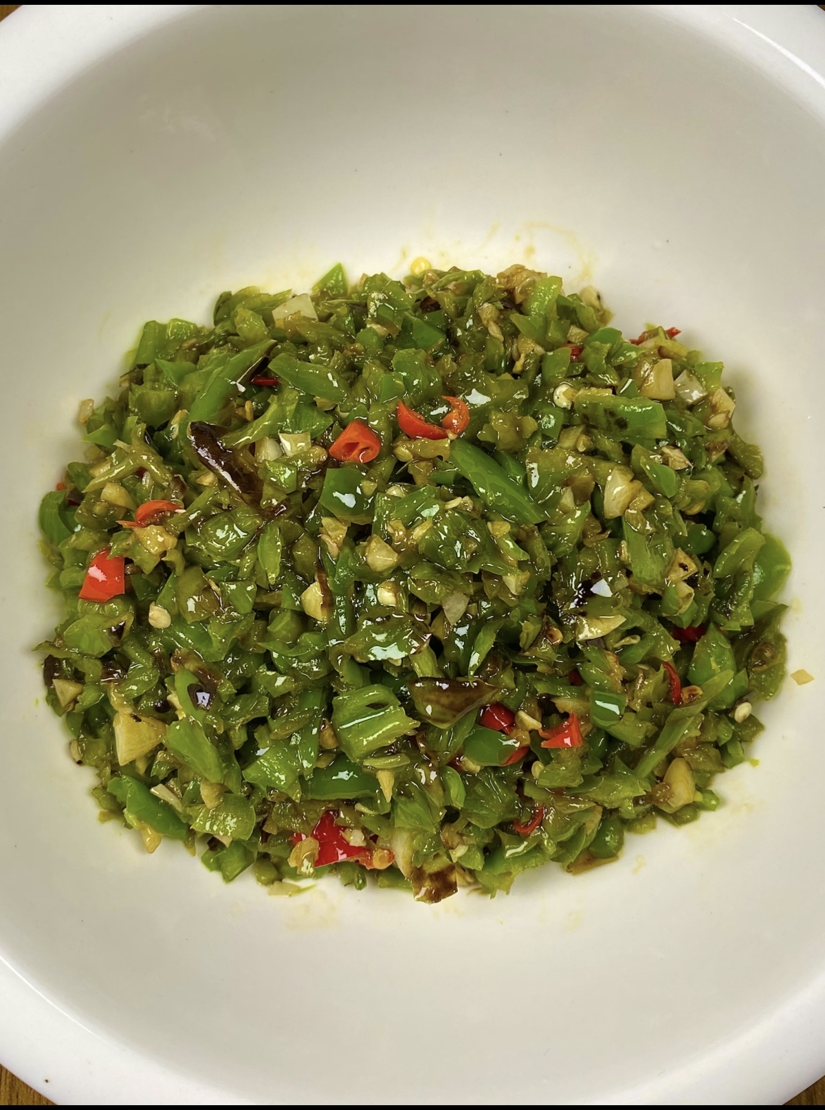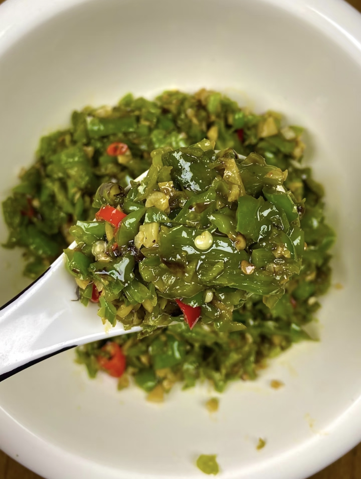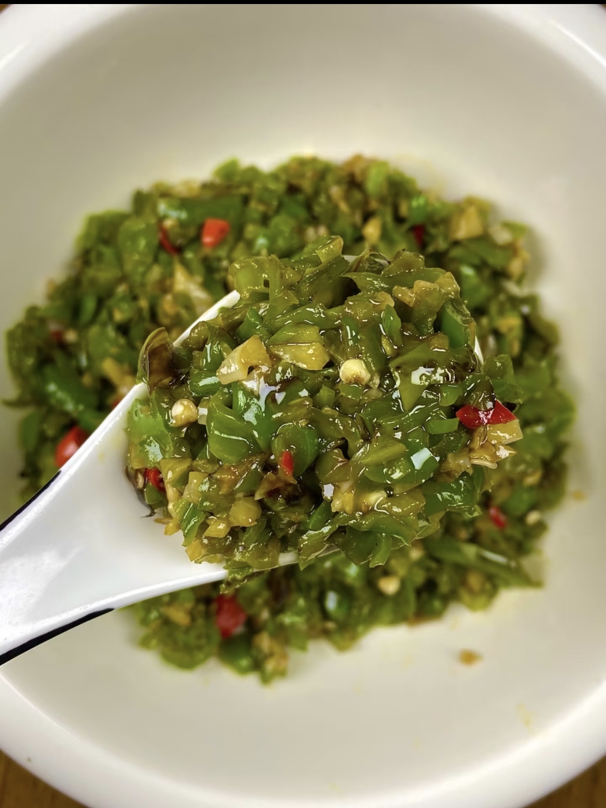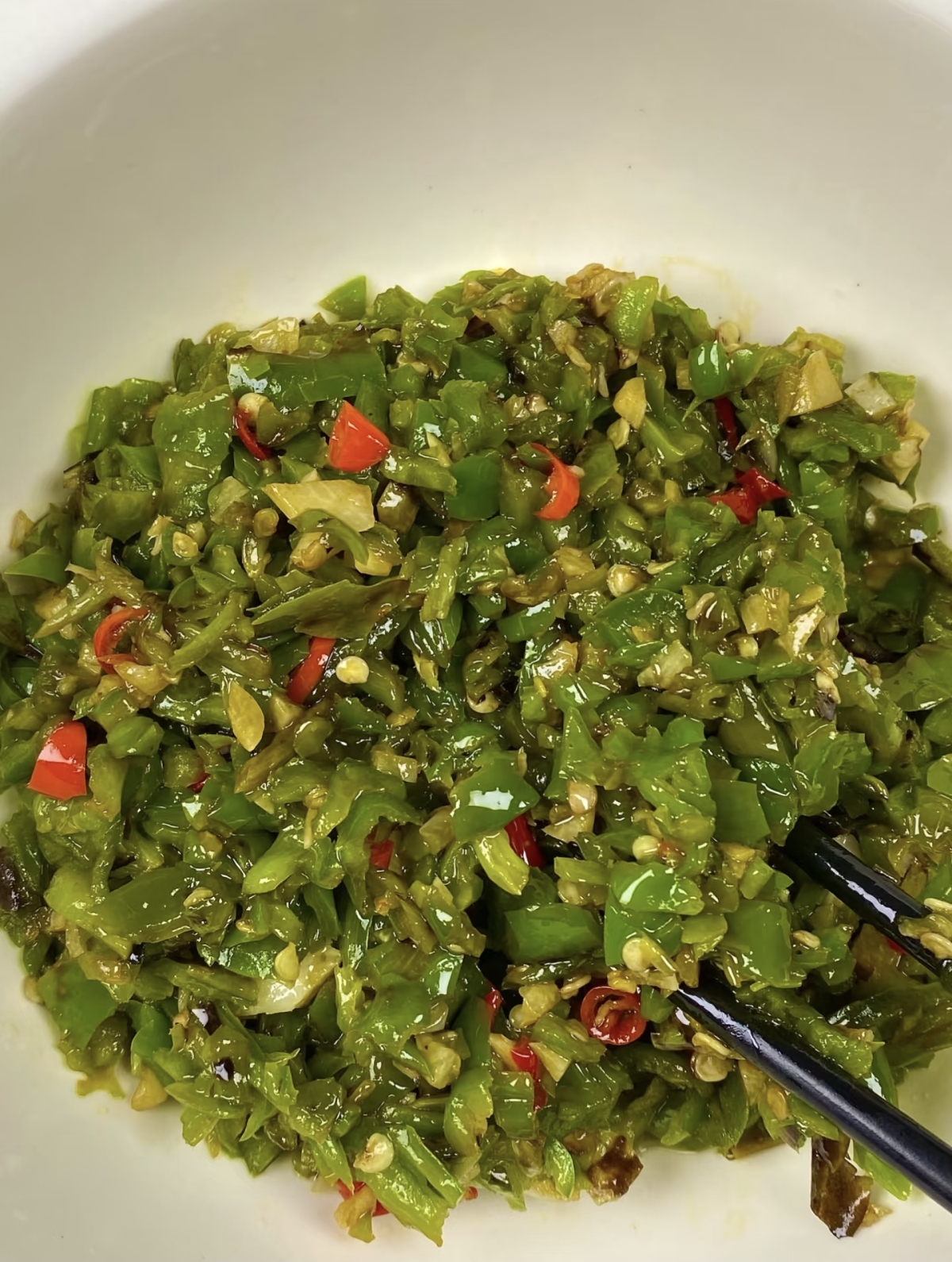 将烤好的辣椒撕去焦皮,去掉蒂和籽,只留下柔软的椒肉,切成小段。然后,把辣椒段和蒜蓉混合在一起,加入适量的盐、白糖、生抽和少许陈醋。盐是基础调味,白糖能提鲜,生抽增加咸鲜层次,而陈醋则能中和辣椒的燥热,让味道更柔和。接着,把熬好的香料油分三次淋入辣椒蒜蓉中。第一次激出辣香,第二次唤醒蒜香,第三次则是让所有香气融合。热油浇下去的瞬间,会听到“滋啦”一声,香气瞬间爆发,整个厨房都弥漫着诱人的味道。最后,根据个人口味淋入一点藤椒油或花椒油,搅拌均匀,一罐色香味俱全的烧椒酱就完成了。